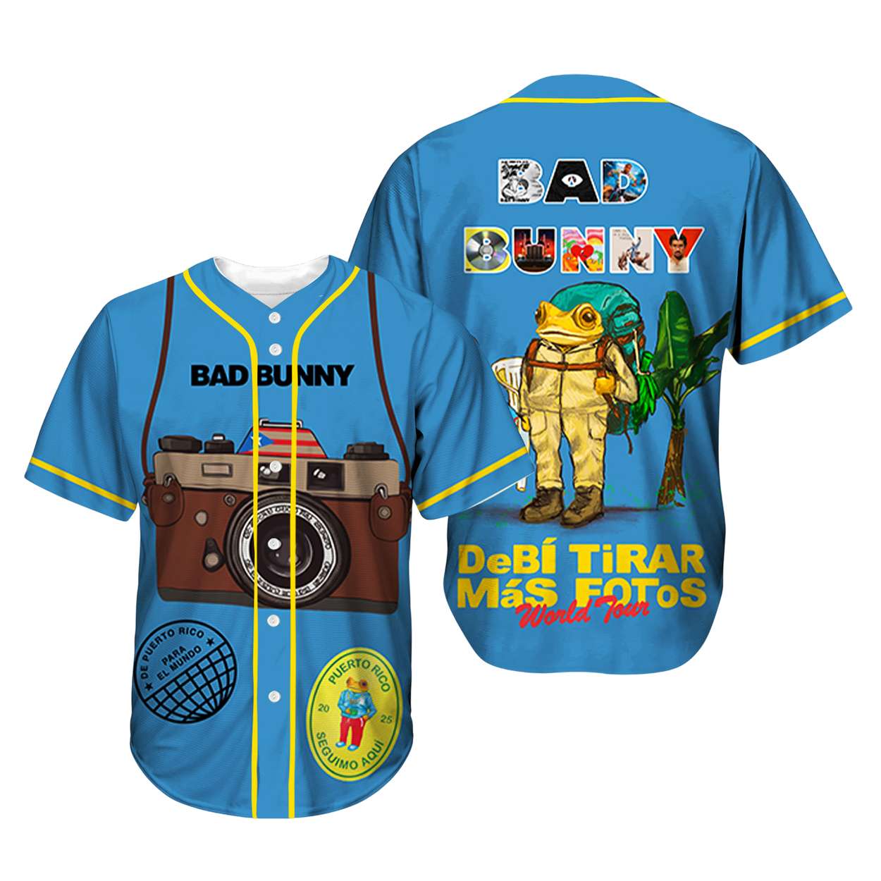 The front design features a retro camera beneath bold “BAD BUNNY” lettering, hinting at the artist’s obsession with memory and documentation. Two patches—“De Puerto Rico al Mundo” and “Seguimo Aquí”—echo the island’s global voice and enduring presence in pop culture.
