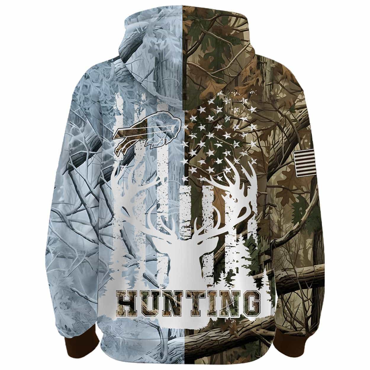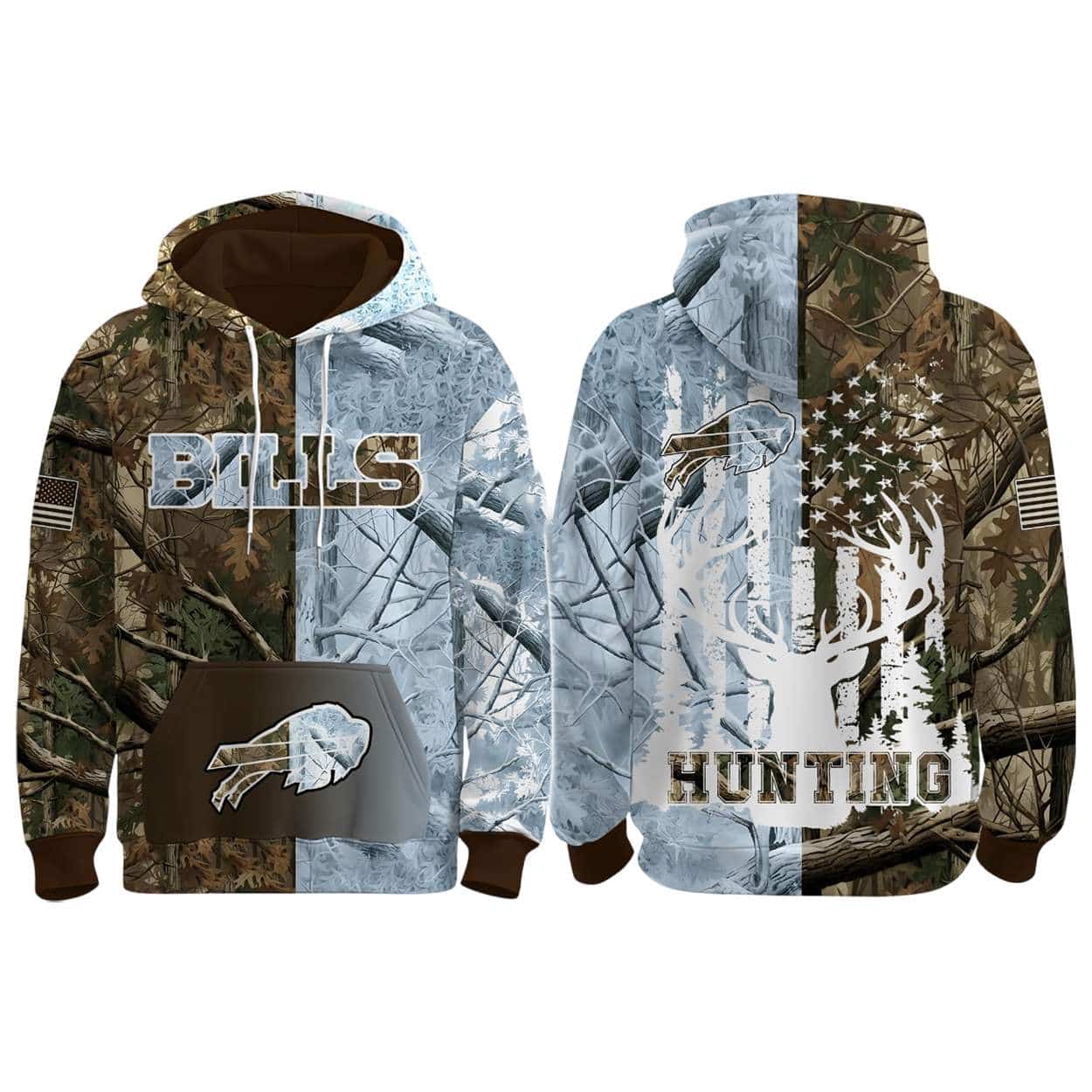 The left side of this hoodie channels the raw energy of woodland terrain, while the icy right half evokes the resilience of winter warriors. Across the chest, “BILLS” stands proud—an emblem of Buffalo’s enduring fight through decades of gridiron battles and community strength.