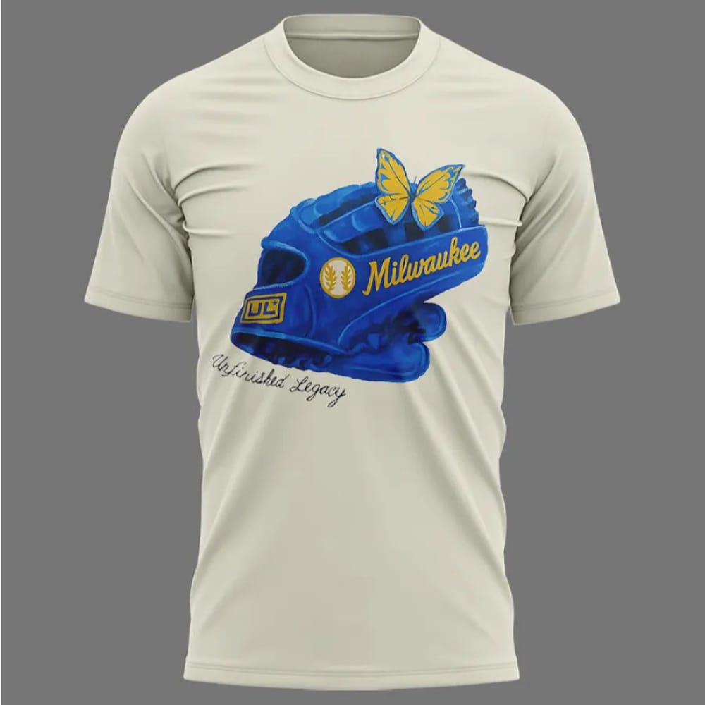 The design of this shirt combines traditional Milwaukee Brewers symbolism with a modern twist. Featuring the Brewers’ iconic “M” logo and glove motif, the shirt embodies the essence of the team’s enduring legacy. The butterfly element adds a creative flair, symbolizing transformation and the beauty of the game, making this a unique piece for any fan’s wardrobe.