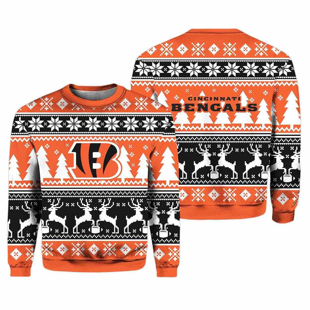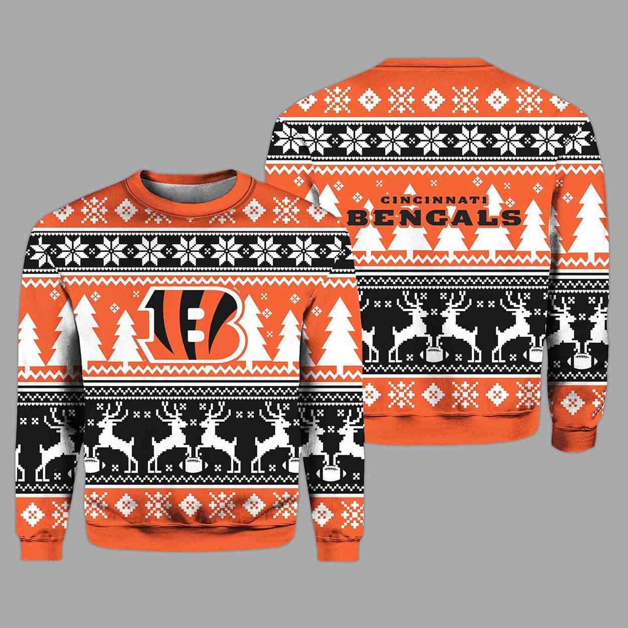 The front showcases the Bengals’ fierce “B” logo, framed by reindeer, trees, and snowflakes—symbols of winter resilience and team pride. It’s a visual tribute to Cincinnati’s enduring football culture and the fans who thrive in every season’s challenge.