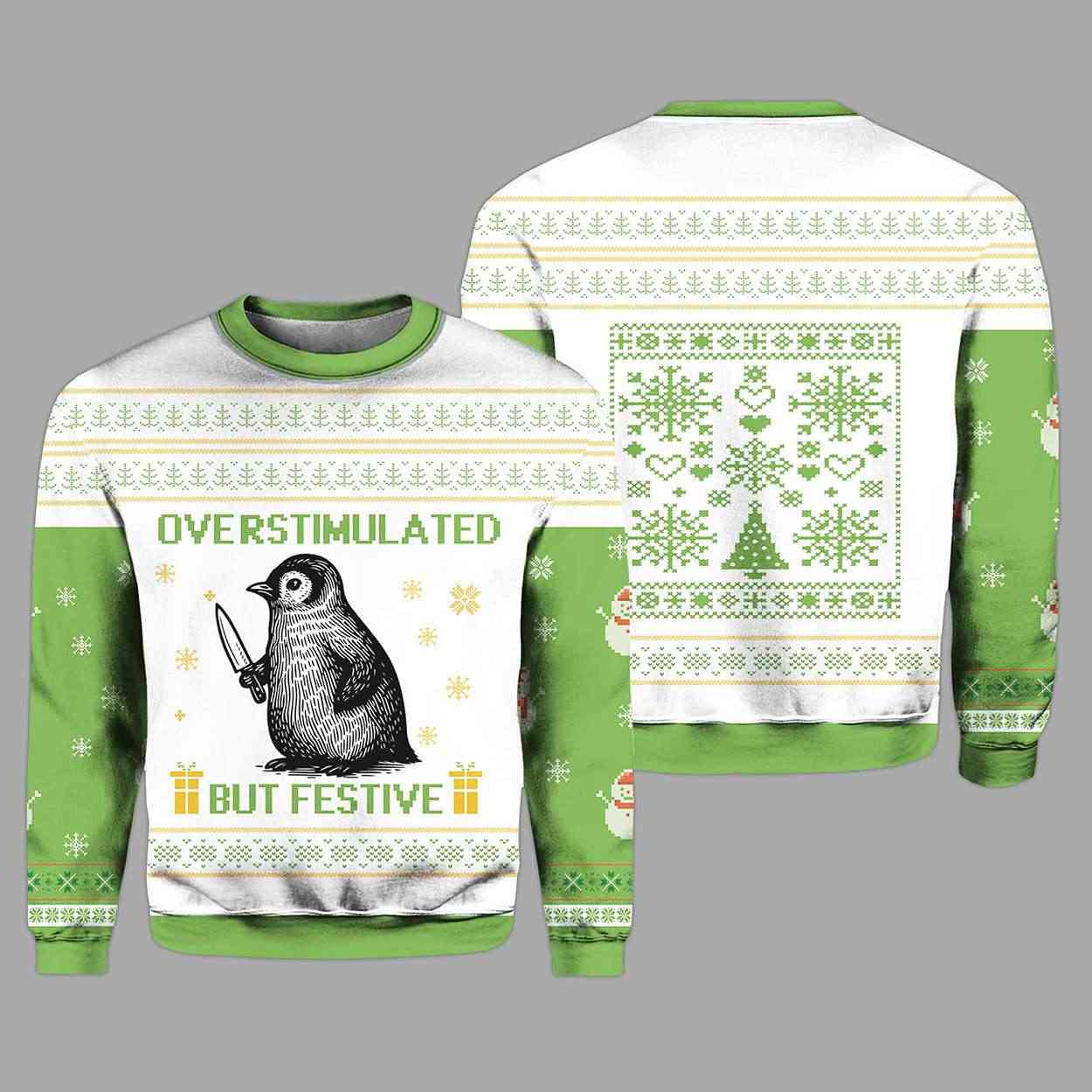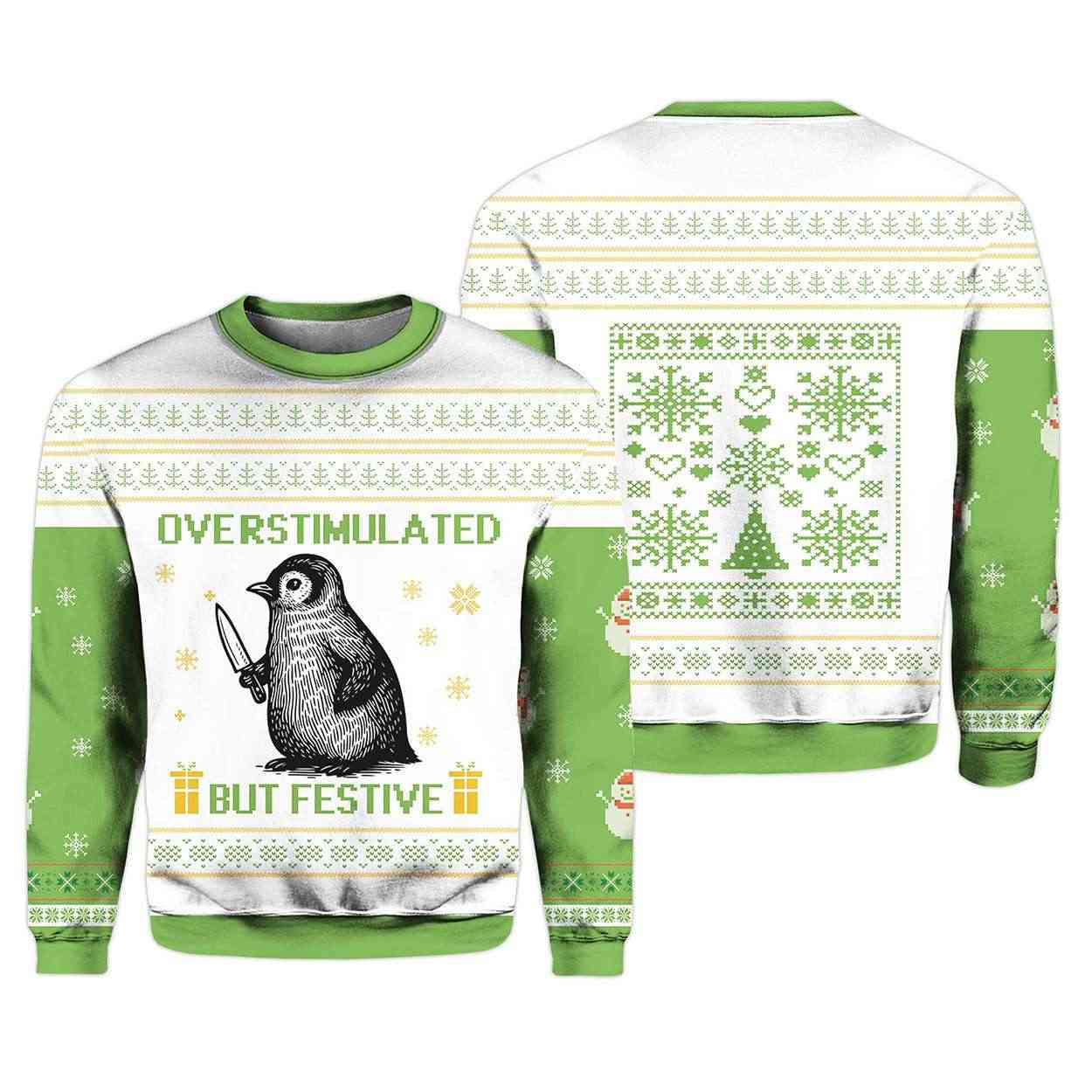 Dive into quirky holiday humor with the 2025 Christmas Penguin Overstimulated Ugly Sweater. Featuring a knife-wielding penguin and pixelated festive motifs, this design blends mental health awareness with seasonal charm. A bold choice for expressive wearers who embrace the chaos of the holidays.