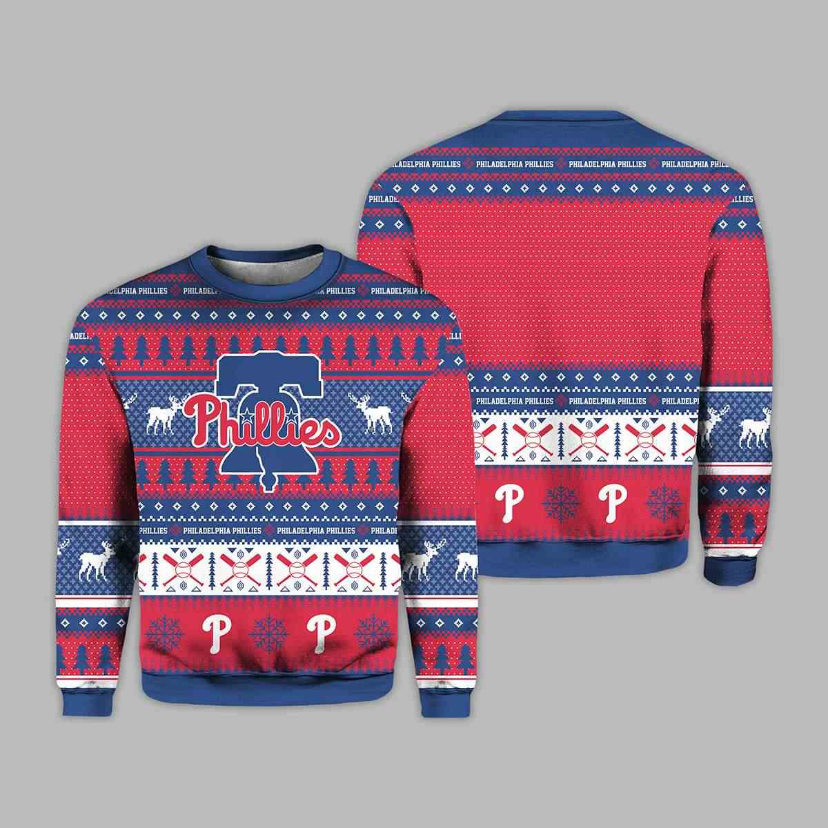 Reindeer and bats flank the sweater’s layout, nodding to legends like Mike Schmidt and Bryce Harper—figures who’ve shaped the team’s identity through grit and charisma. Their legacy lives on in every stitch, connecting fans across generations.
