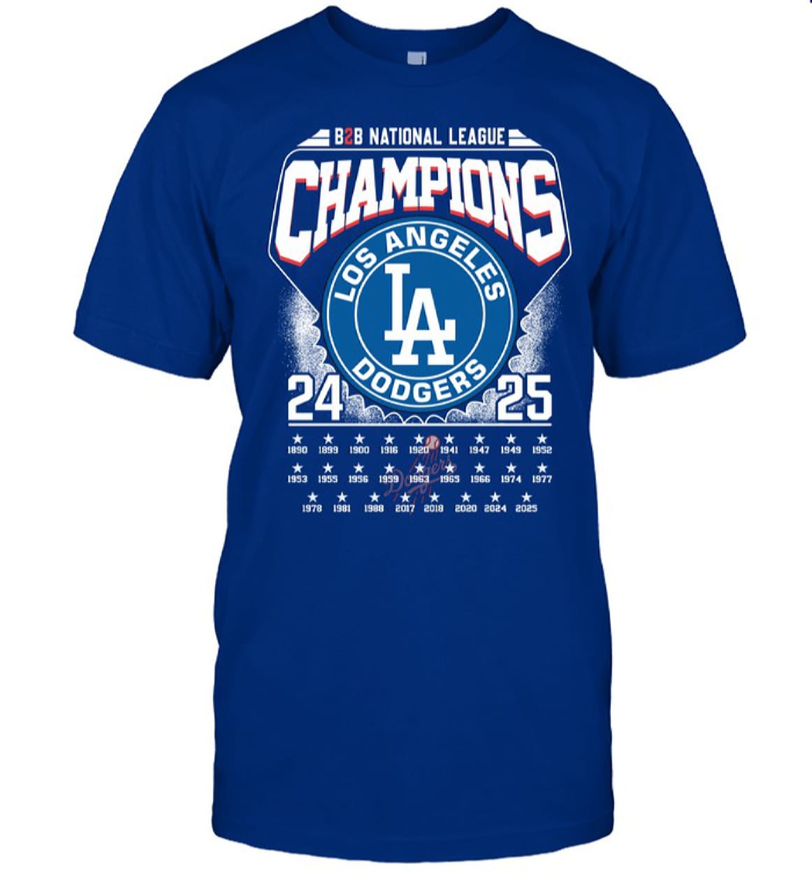 Show your Dodgers pride with the 2025 Dodgers B2B NL Champions Two-Sided Shirt. Featuring game dates, iconic players, and a nod to LA’s resilient spirit, this shirt connects baseball glory with cultural grit. A must-have for true fans and history lovers.