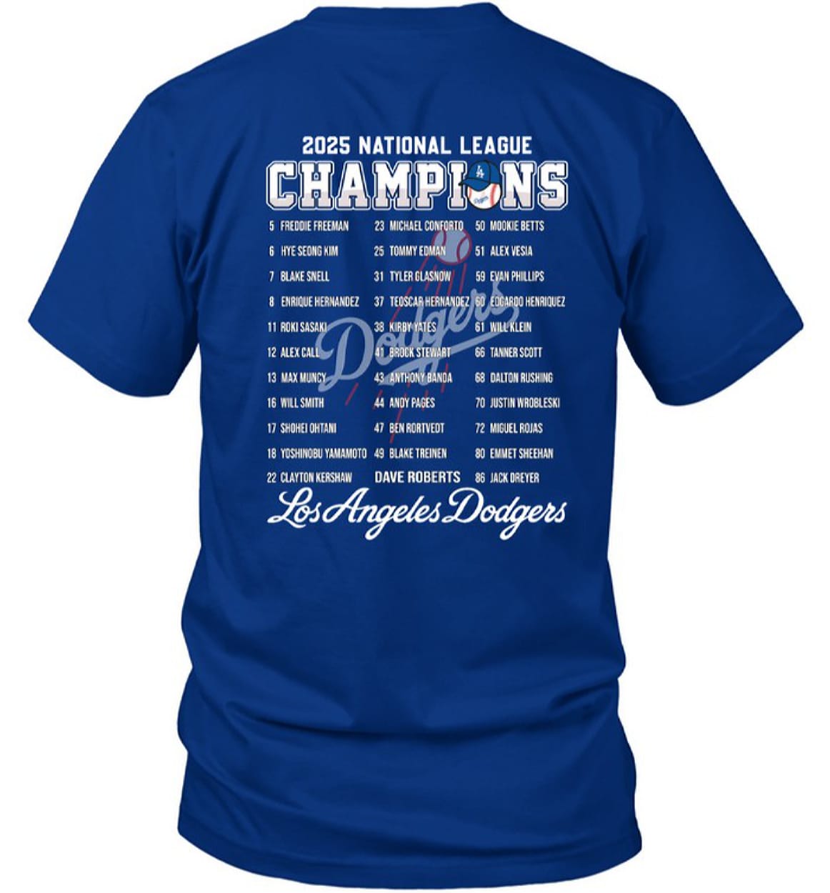 The front design boldly showcases “National League Champions” above the iconic LA logo, flanked by the numbers 24 and 25—marking consecutive triumphs. These digits echo the Dodgers’ back-to-back dominance, a feat not seen since the franchise’s golden era in the 1970s.