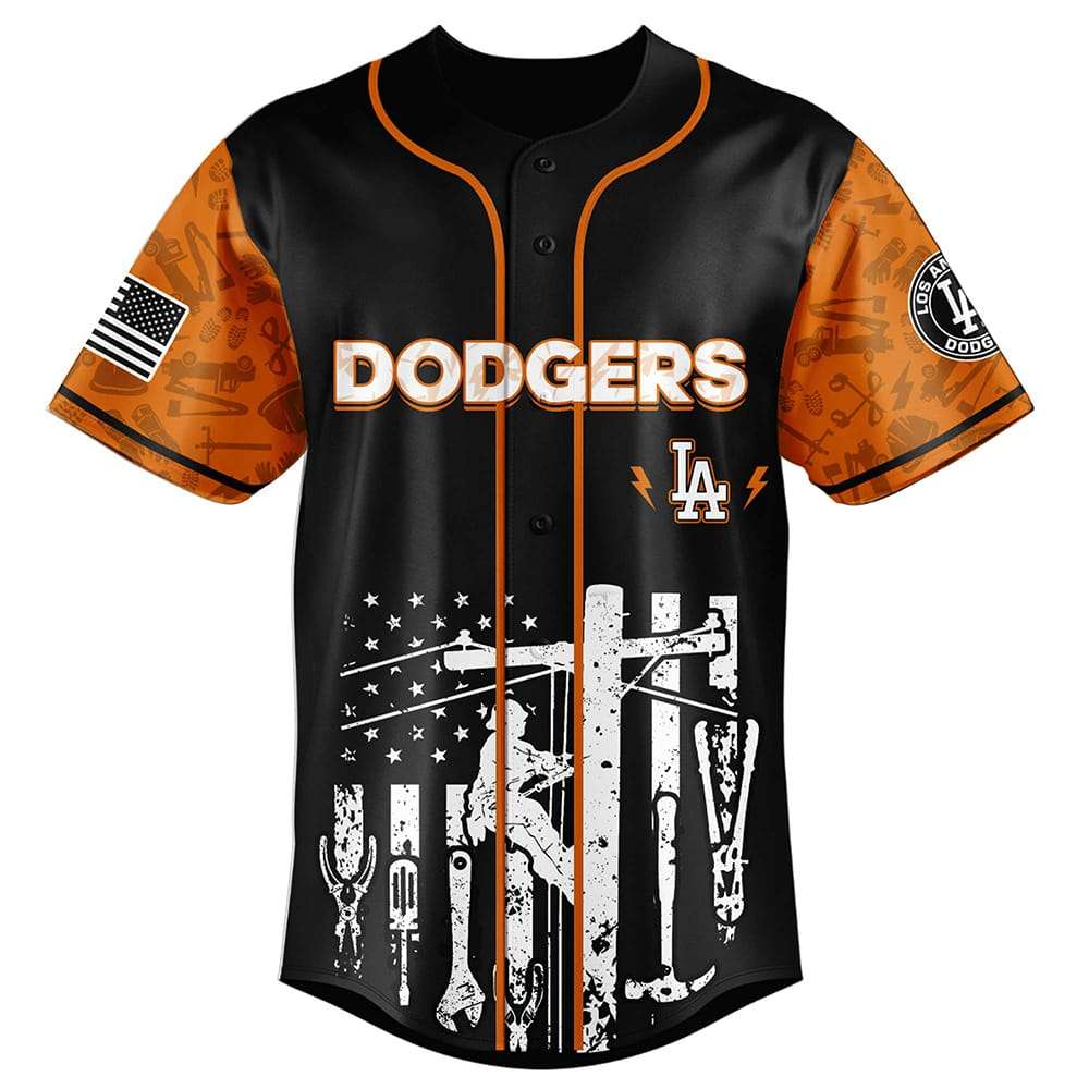 Electric orange sleeves covered in tool silhouettes meet a jet-black torso where “DODGERS” blazes across twin lightning bolts. Below, a lone lineman scales a pole, his silhouette framed by rows of wrenches and pliers that double as flag stripes—a graphic nod to the hands that keep ballparks bright.