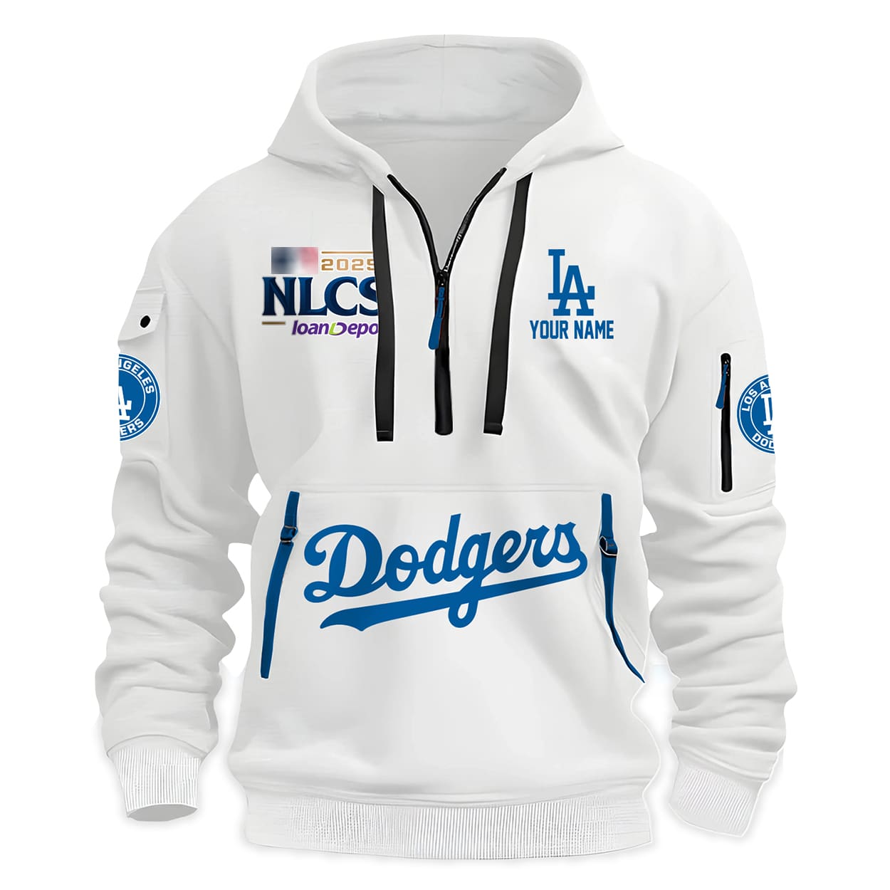 This sharp, white, utility-style hoodie is packed with details, making it ideal for the cold weather of the postseason. It proudly features the NLCS 2025 logo, the iconic “Dodgers” script across the front pouch, and the classic “LA” logo. What makes this hoodie unique are the rugged, tactical details: a half-zipper neckline, snap-button shoulder utility pockets, and reinforced side entry pockets on the main pouch, all trimmed with bold blue and orange accents. This is the ultimate piece of baseball fan gear for any Dodgers supporter following the road to the World Series.