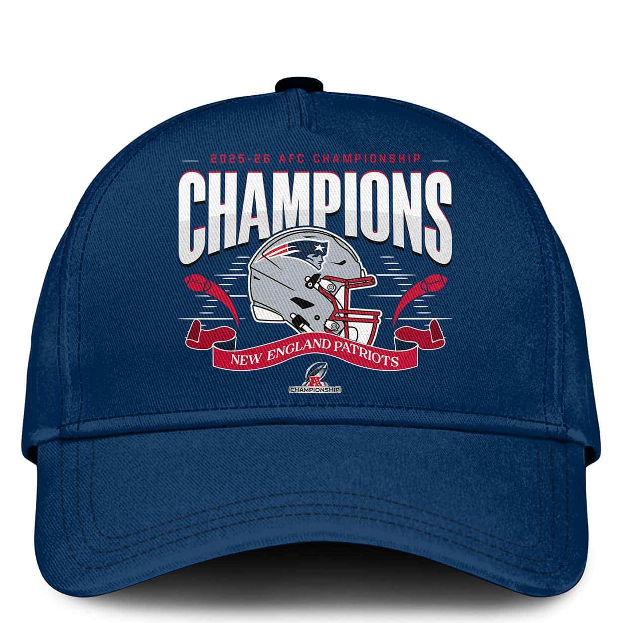 The front design captures the essence of the 2025-26 AFC Championship, where the Patriots surged past expectations. A helmet graphic anchors the moment, flanked by bold lettering and the team’s name—symbolizing unity, resilience, and a season carved into football lore.