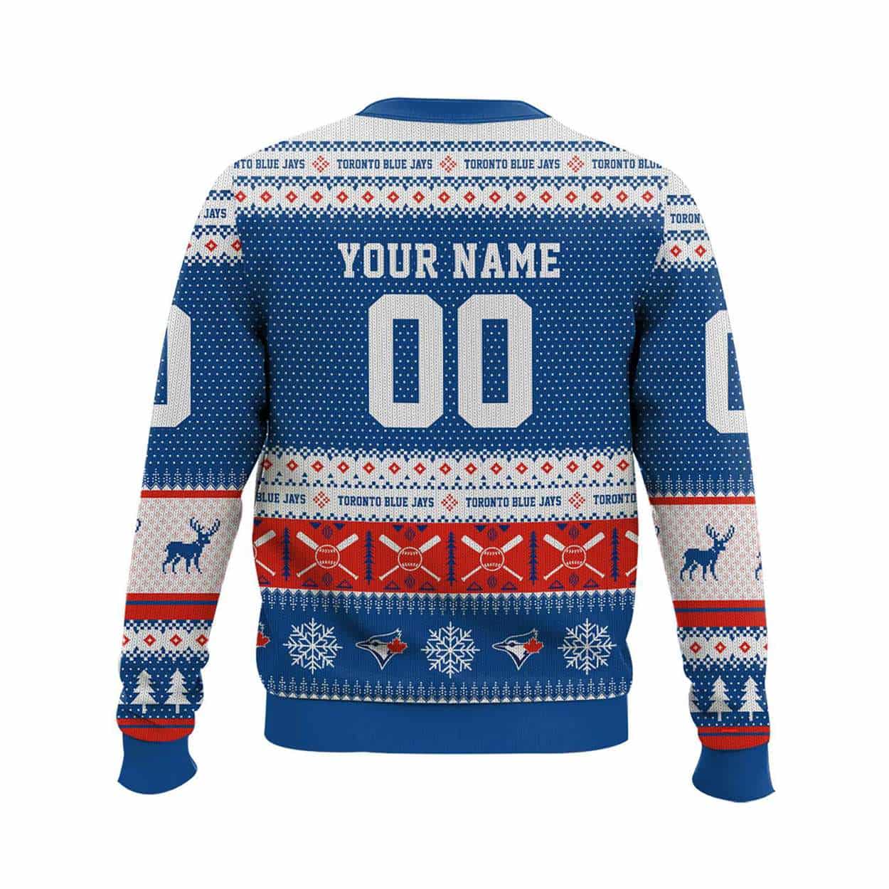 Show off your Blue Jays pride with this 2025 Personalized Blue Jays Ugly Christmas Sweater featuring iconic team symbols, festive flair, and your custom name and number. A nostalgic nod to Toronto’s baseball legacy and holiday spirit, crafted for passionate fans.