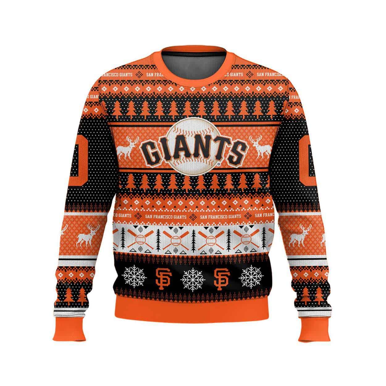 The front design bursts with vibrant orange and black, echoing the Giants’ enduring identity. Snowflakes and reindeer flank the iconic logo, a nod to the team’s resilience and the city’s winter charm. It’s a visual anthem for Bay Area pride.