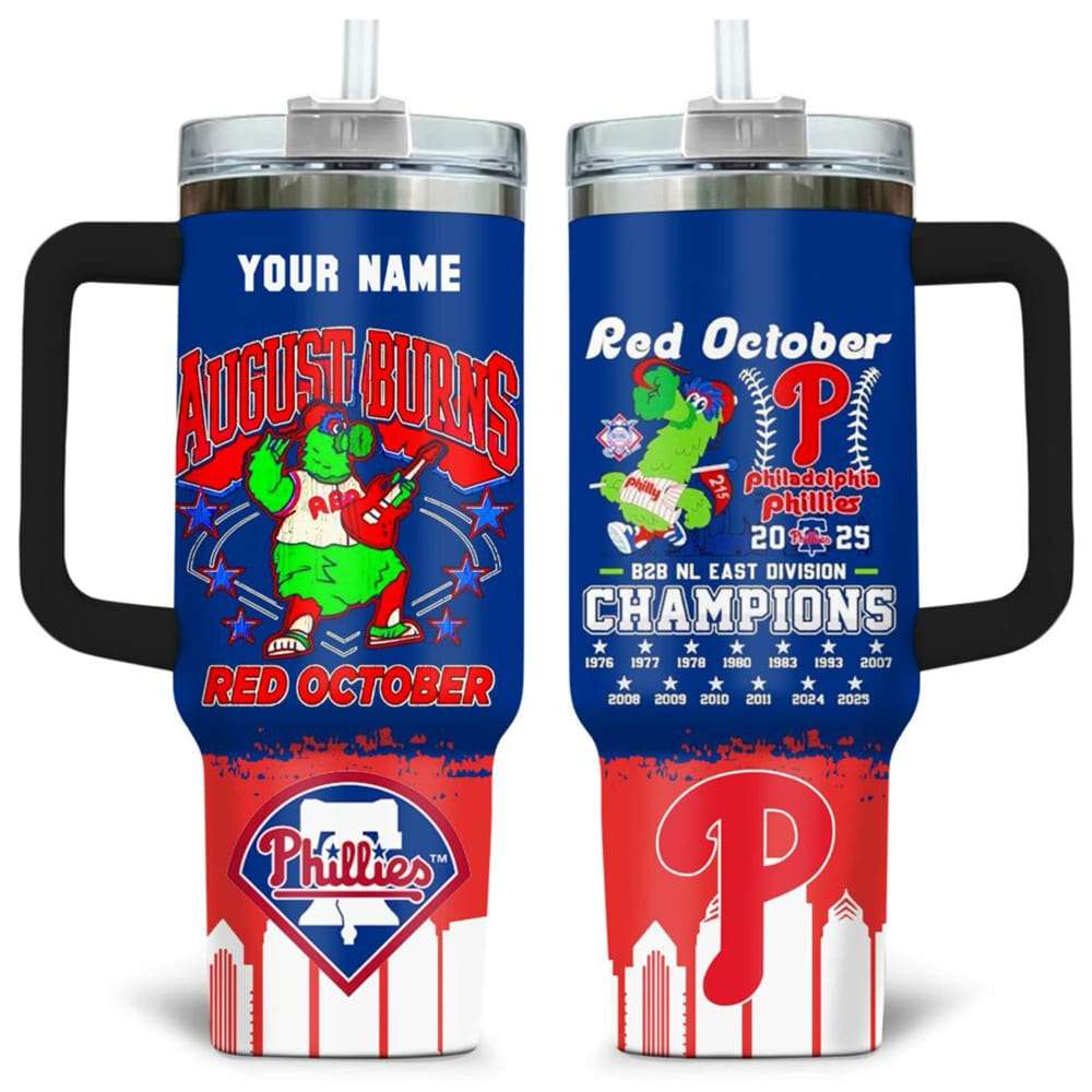 On the front, the recognizable “Red October” theme highlights the Phillies’ dominant run, symbolizing their hard-fought journey. The logo proudly showcases their latest achievement, echoing the team’s resilience and consistent success in the division. It’s not just a tumbler; it’s a tribute to a remarkable sports legacy.