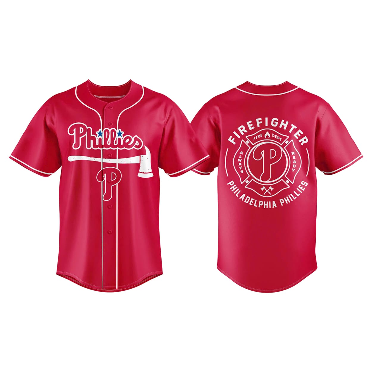 Stand out with the 2025 Phillies Firefighter Application Jersey, a bold fusion of baseball pride and heroic tribute. Inspired by Philadelphia’s firefighters, it reflects resilience, brotherhood, and community service—perfect for fans honoring courage both on the field and in daily life.