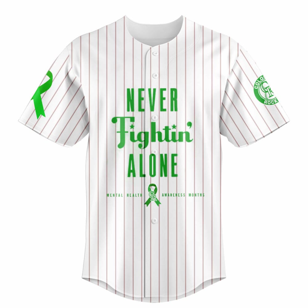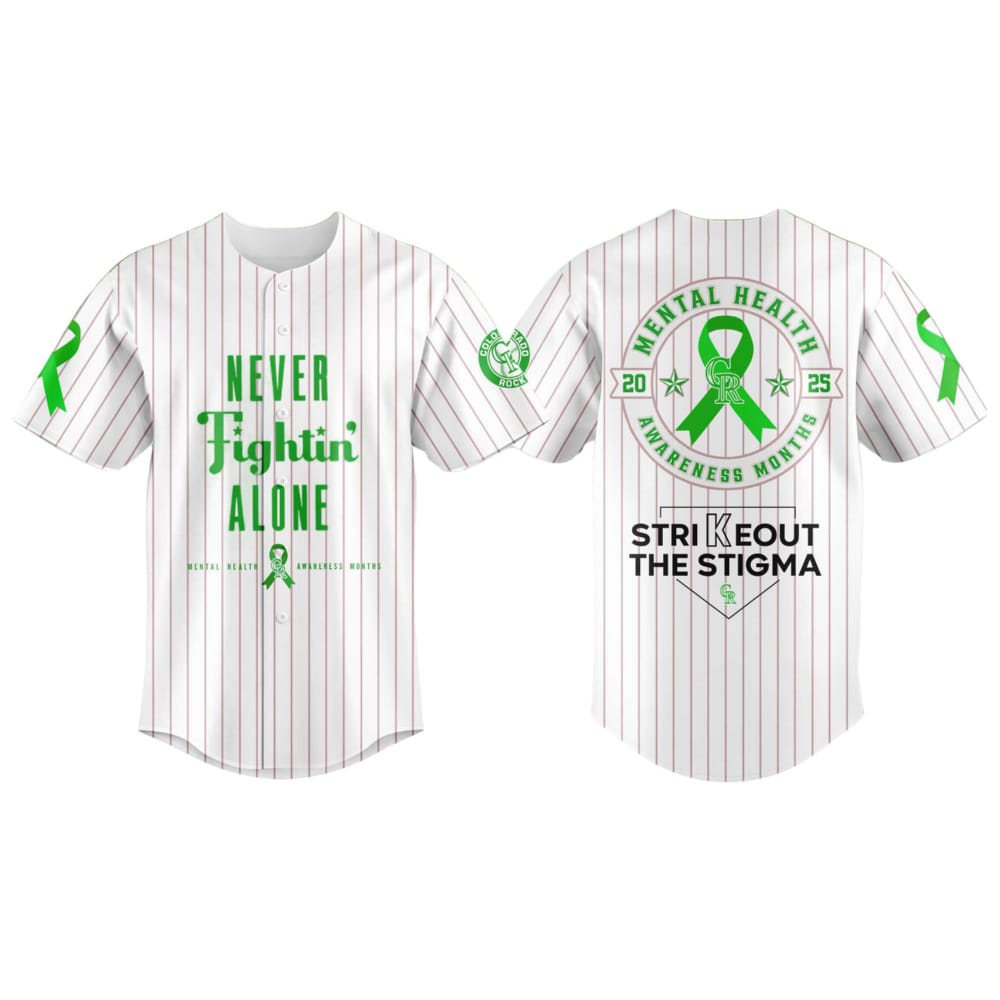 This 2025 Rockies Mental Health Awareness Week Jersey stands out with its powerful green ribbon and impactful slogans, symbolizing strength and support for mental health warriors. The front proudly declares “Never Fightin’ Alone,” reminding wearers and viewers that nobody has to battle mental health challenges in isolation.