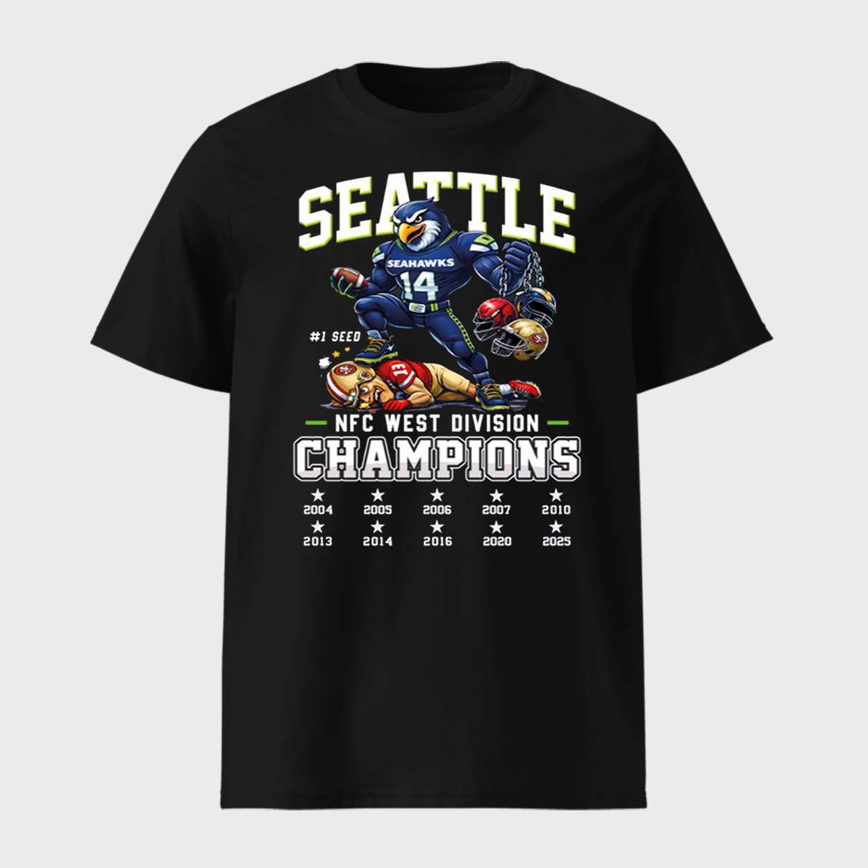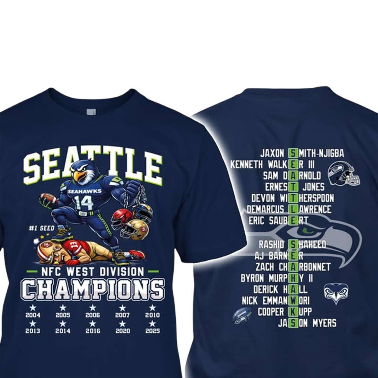 The front showcases Seattle’s mascot towering over a fallen rival, symbolizing the fierce 2025 division victory. With #1 seed status and a legacy of dominance, the shirt immortalizes a season defined by grit, unity, and regional pride.