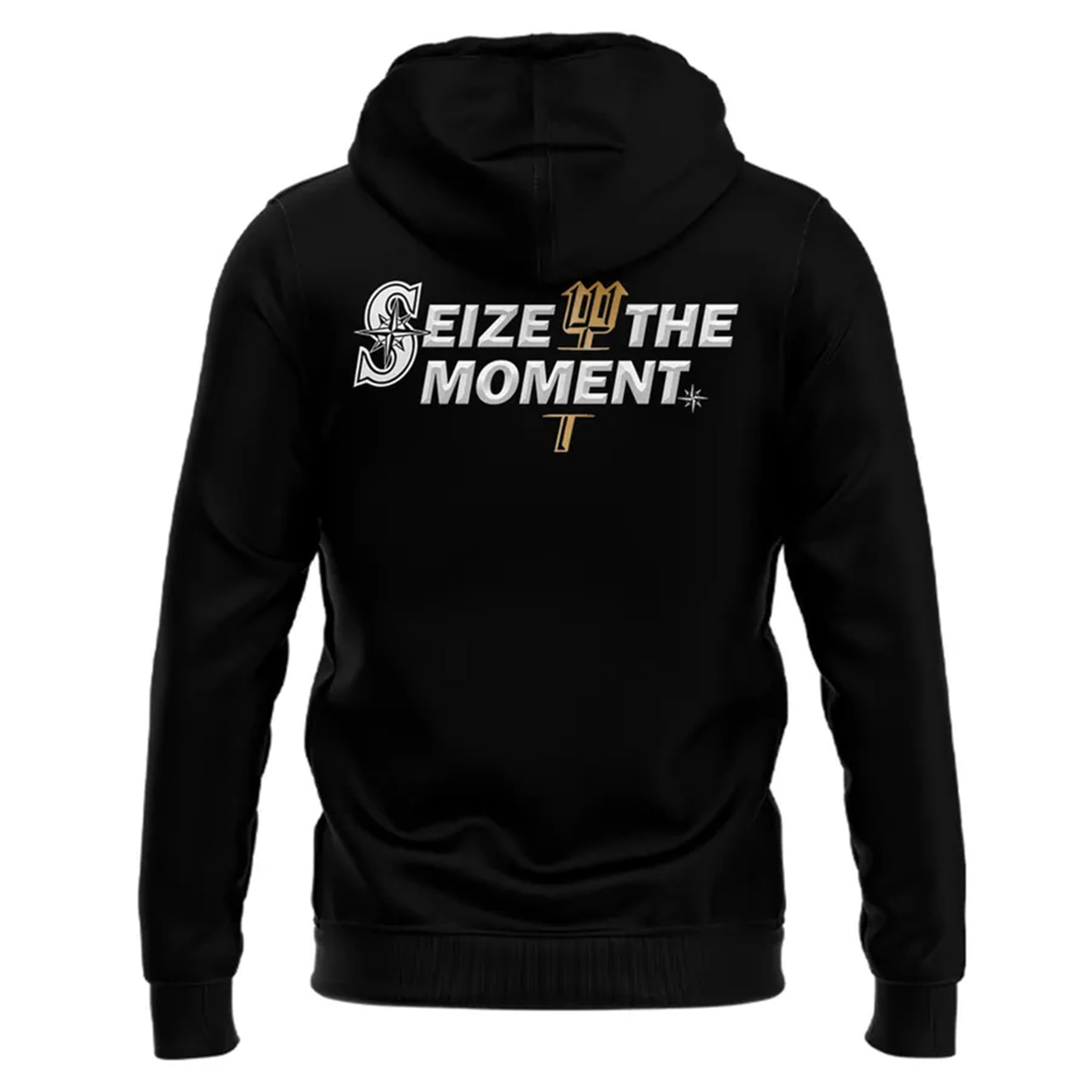 This hoodie is styled for true dedication. The front prominently features the iconic Mariners “S” logo set inside a striking gold-trimmed diamond, with “2025 ALCS” boldly celebrating the achievement. The back of the hoodie carries the motivational playoff slogan, “SEIZE THE MOMENT,” rendered in white and gold lettering, with a trident replacing the “T”. The black and gold color combination gives this piece of baseball fan gear a premium, high-stakes look, perfect for wearing to T-Mobile Park or while watching the playoffs at home.