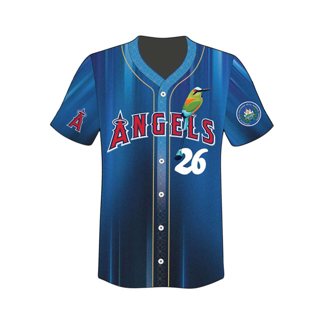 The front of this 2026 Angels jersey showcases a radiant turquoise-browed motmot, El Salvador’s national bird, perched above bold “ANGELS” lettering. The number 26 anchors the design, marking the year and symbolizing shared pride between fans and heritage.