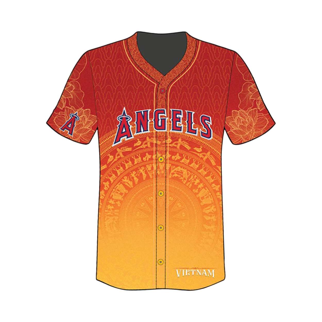 “ANGELS” appears with a diacritical mark, blending sport with linguistic pride. Below, “VIETNAM” anchors the design, paying homage to generations who built Little Saigon into a thriving cultural hub and beacon of Vietnamese American life.