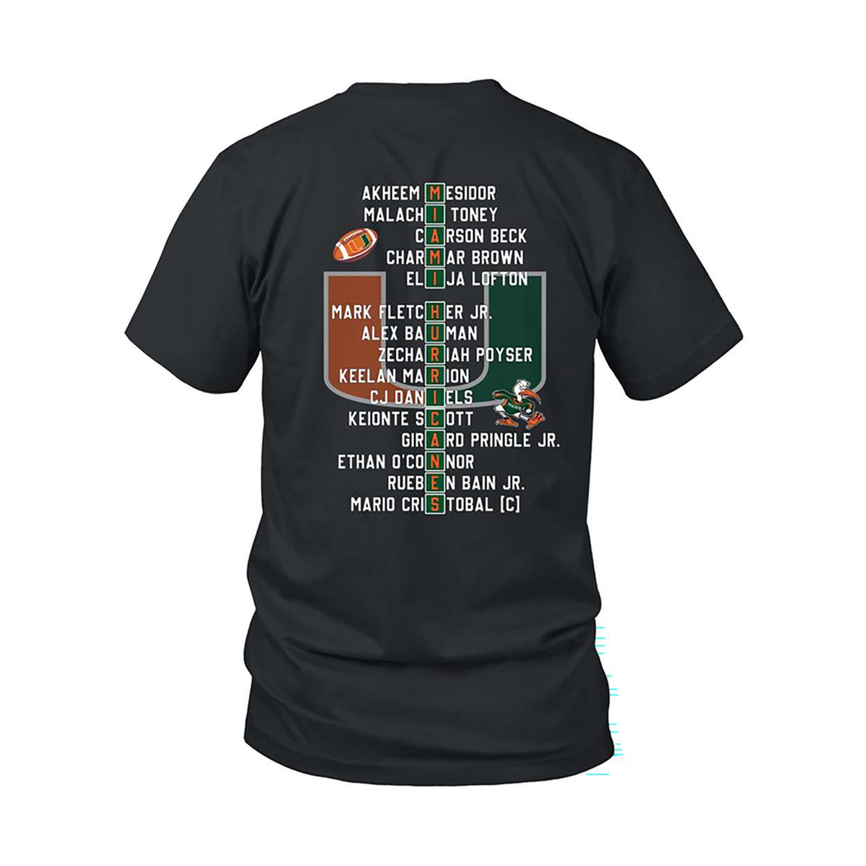 On the back, names like Carson Beck, Rueben Bain Jr., and Akheem Mesidor form a vertical tribute spelling “MIAMI HURRICANES.” Each name reflects the strength, drive, and identity of a squad that inspired fans across generations and backgrounds.