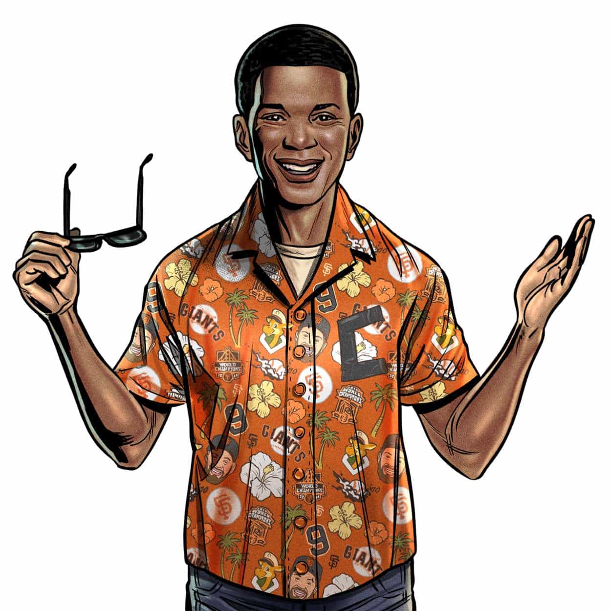 This 2026 Aloha shirt bursts with personality, featuring caricatures of Brandon Belt in Giants gear alongside palm trees, hibiscus blooms, and the number 9—his iconic jersey number. It’s a lively tribute to one of the team’s most beloved figures.
