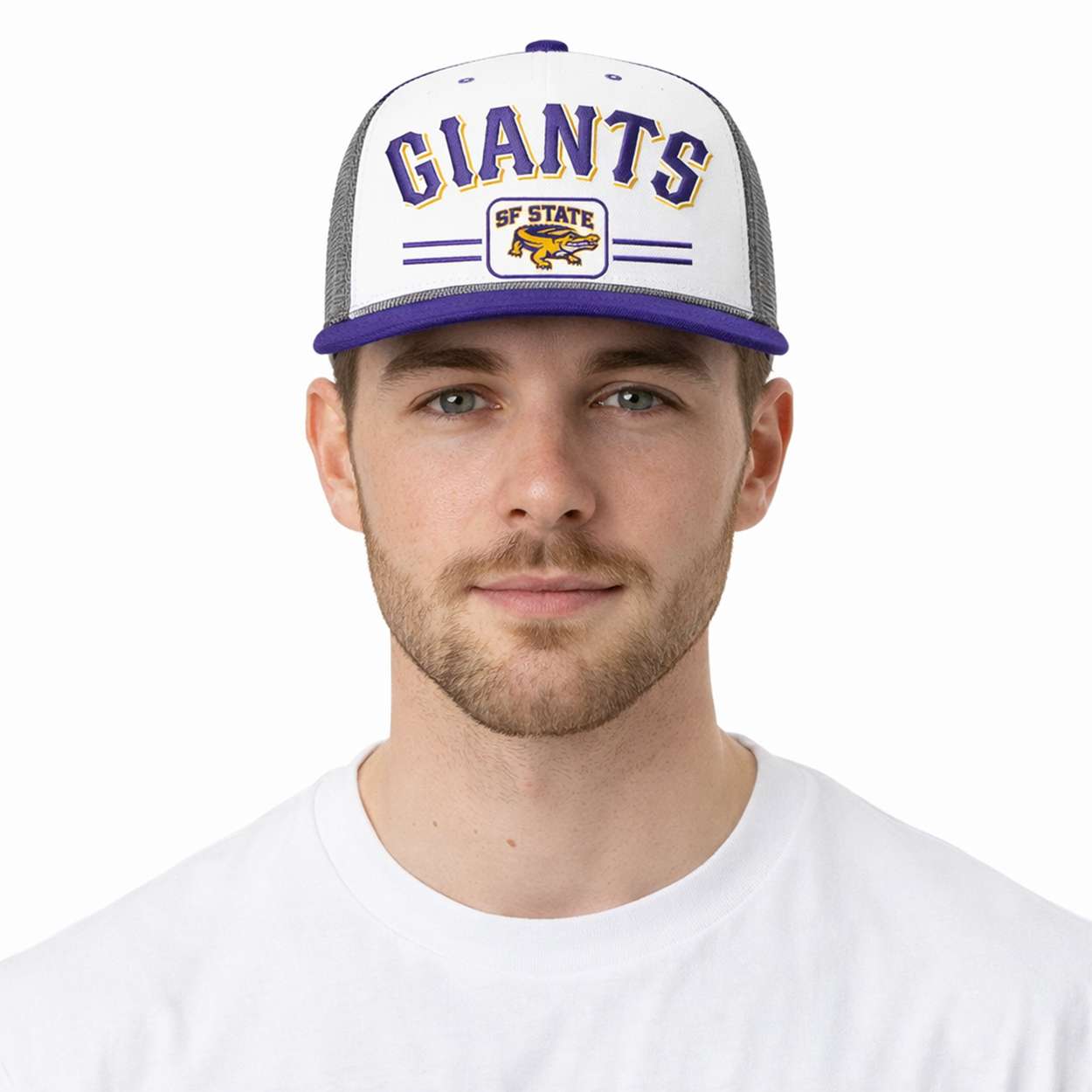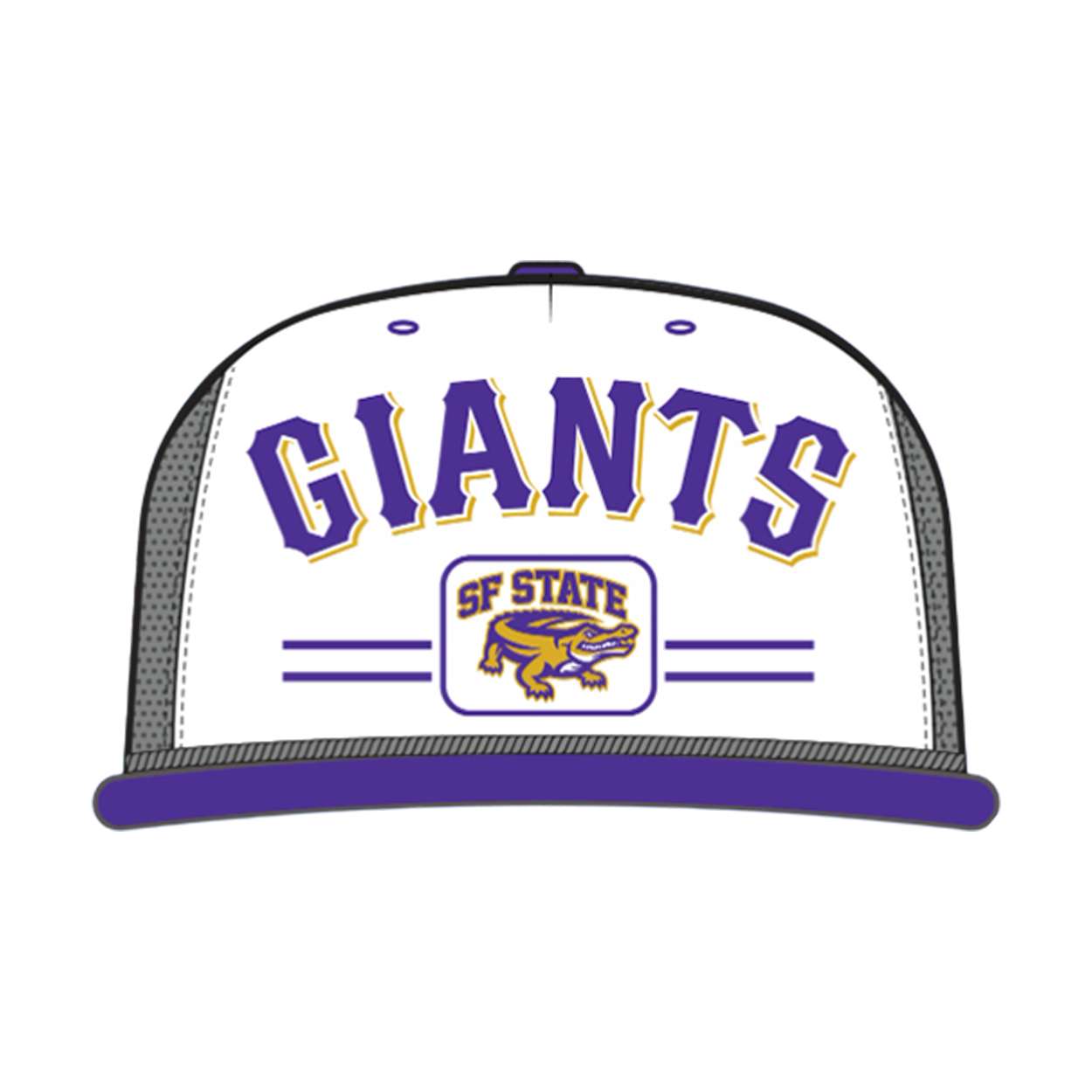 The front of this roped hat features “GIANTS” in bold purple lettering, paired with the SF State Gator logo—an emblem of determination and identity. The design reflects the university’s vibrant student body and its long-standing commitment to social justice.