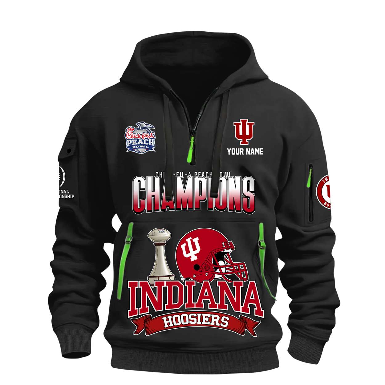Showcase Indiana’s historic 2026 Peach Bowl win with this 2026 Indiana Football Chick-fil-a Peach Bowl Champions Half Zip Hoodie featuring bold championship graphics, iconic logos, and customizable details. A tribute to Hoosier grit, football legacy, and the athletes who reshaped the narrative of Indiana sports excellence.