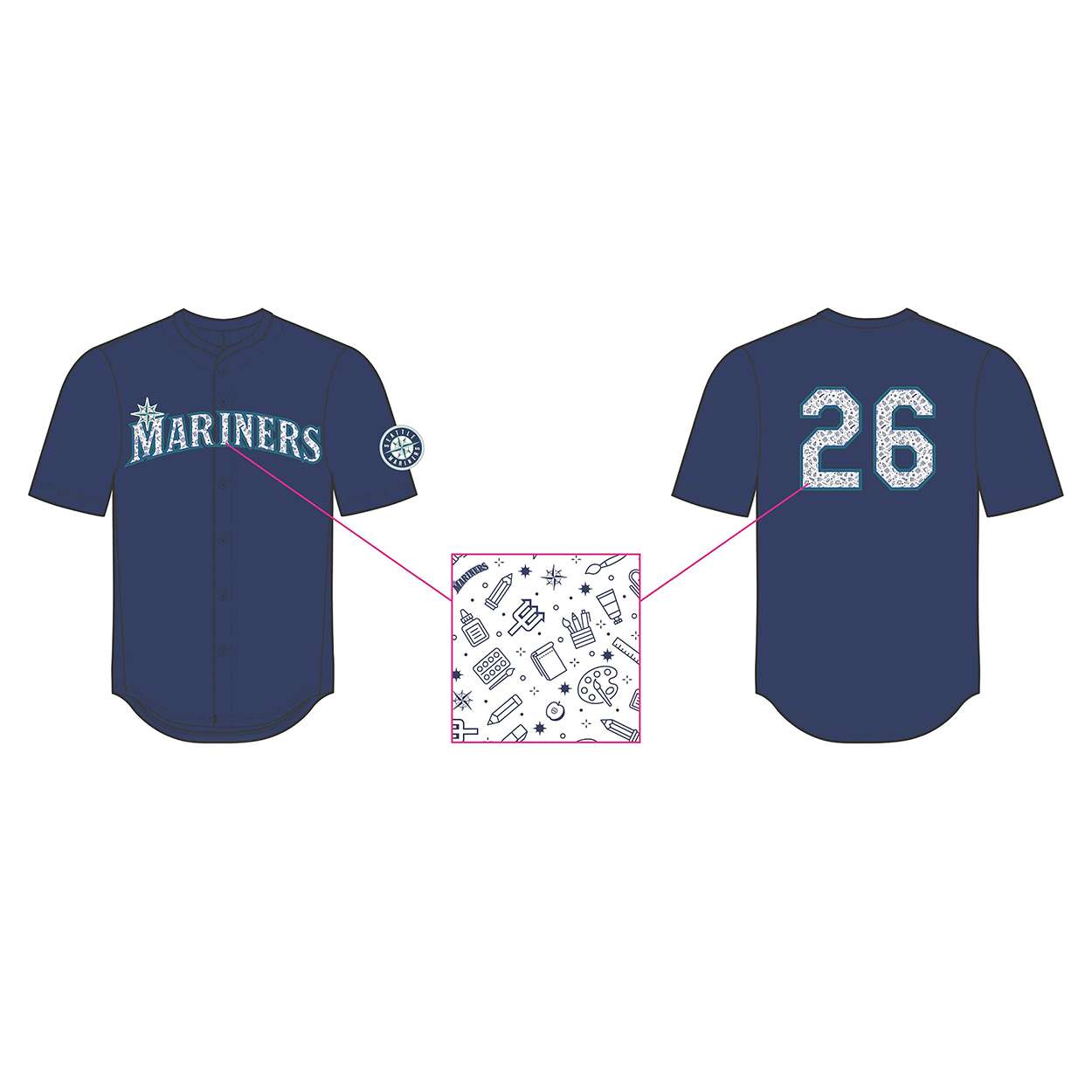 The compass rose and stylized lettering reflect Mariners history, while the intricate artistic icons woven into the numbers honor the imagination teachers spark daily. Fans wearing this jersey connect to both baseball tradition and the enduring influence of education in society.