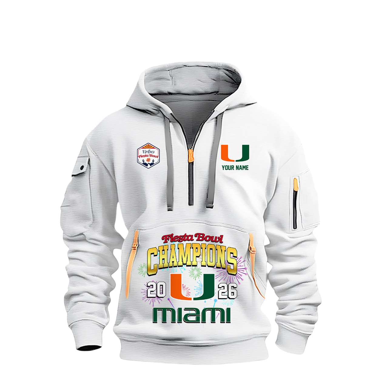 Show your Hurricanes pride with the 2026 Miami Hurricanes Fiesta Bowl Champions Quarter Zip Hoodie. Featuring bold graphics and customizable details, this hoodie honors Miami’s historic win and the legacy of athletes who’ve shaped college football’s cultural and competitive landscape.