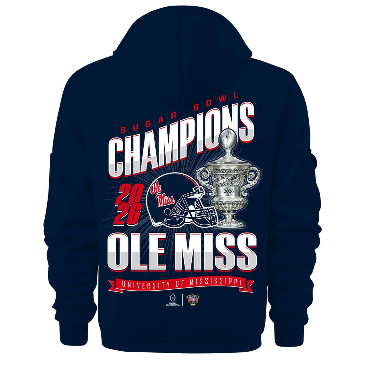 Honor Ole Miss’s 2026 Sugar Bowl triumph with the 2026 Ole Miss Sugar Bowl Champions Quarter Zip Hoodie. Featuring bold graphics and game details, this hoodie captures the Rebels’ playoff victory over Georgia, standout performances, and the enduring legacy of a program built on grit and Southern pride.