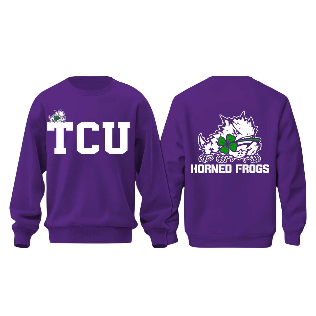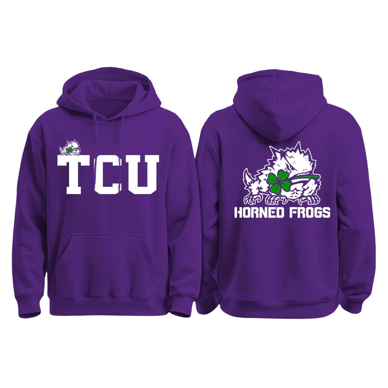 On the back, the bold “Horned Frogs” lettering reinforces community and loyalty, reminding wearers of the collective energy that defines TCU. The combination of mascot and clover imagery bridges history, sport, and cultural symbolism, making this hoodie a statement of pride and global connection.