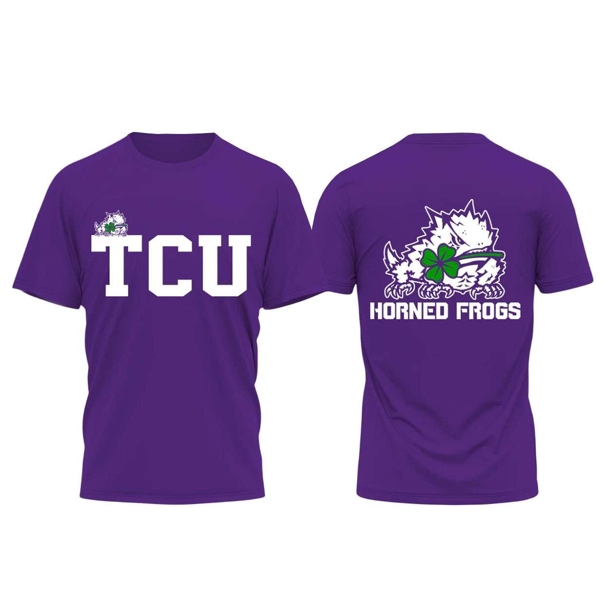 The front design highlights TCU’s iconic Horned Frog mascot paired with a four‑leaf clover, symbolizing resilience and fortune. This imagery ties into the university’s athletic legacy, where the Horned Frog has long represented determination and pride across generations of students and fans.