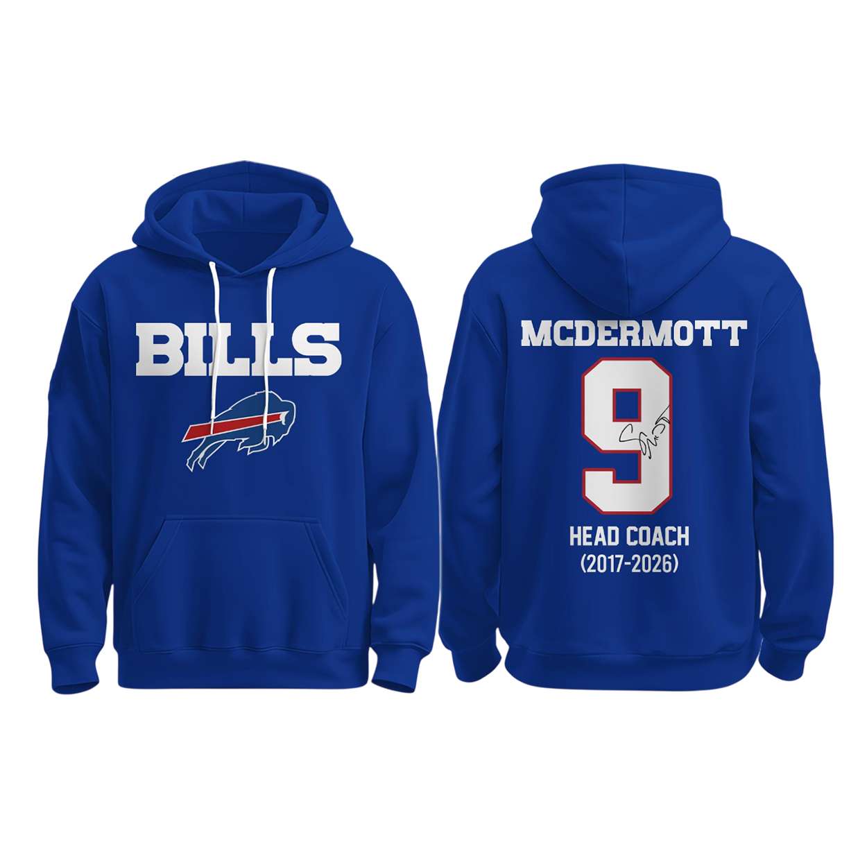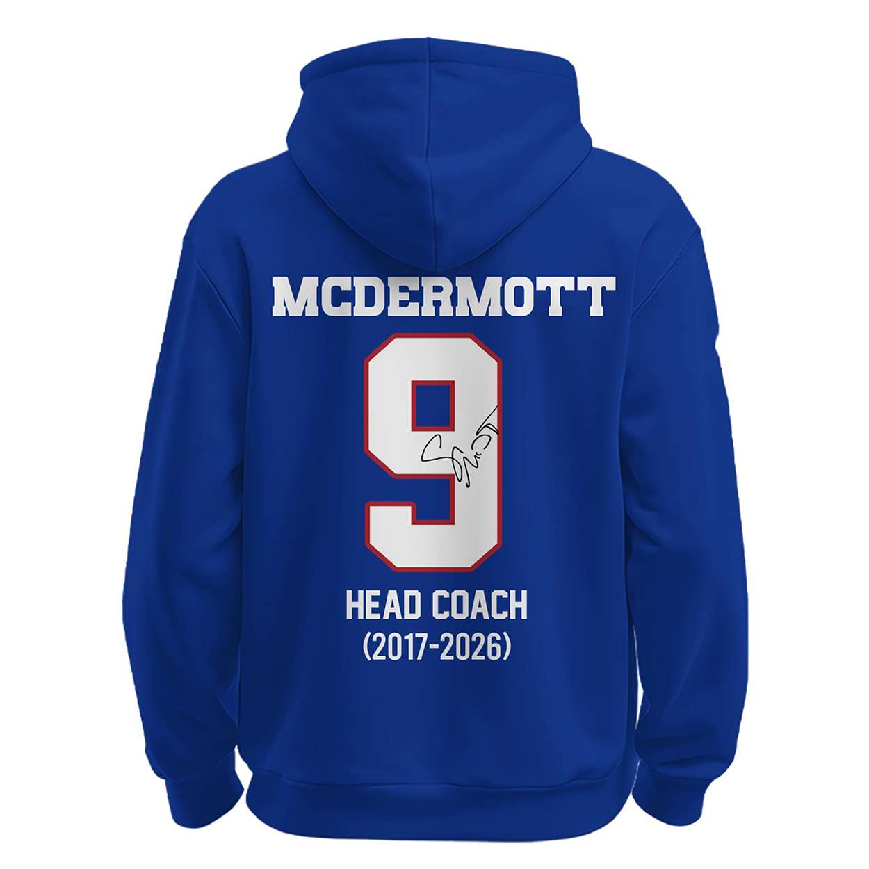 The front design features “BILLS” above the iconic charging buffalo, anchoring the hoodie in team pride. McDermott’s strategic vision and steady hand brought Buffalo back into national relevance, reshaping the franchise’s identity through grit, unity, and purpose.
