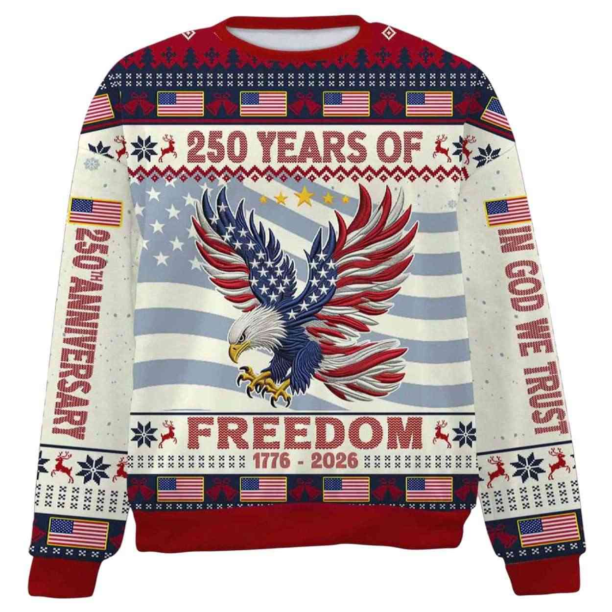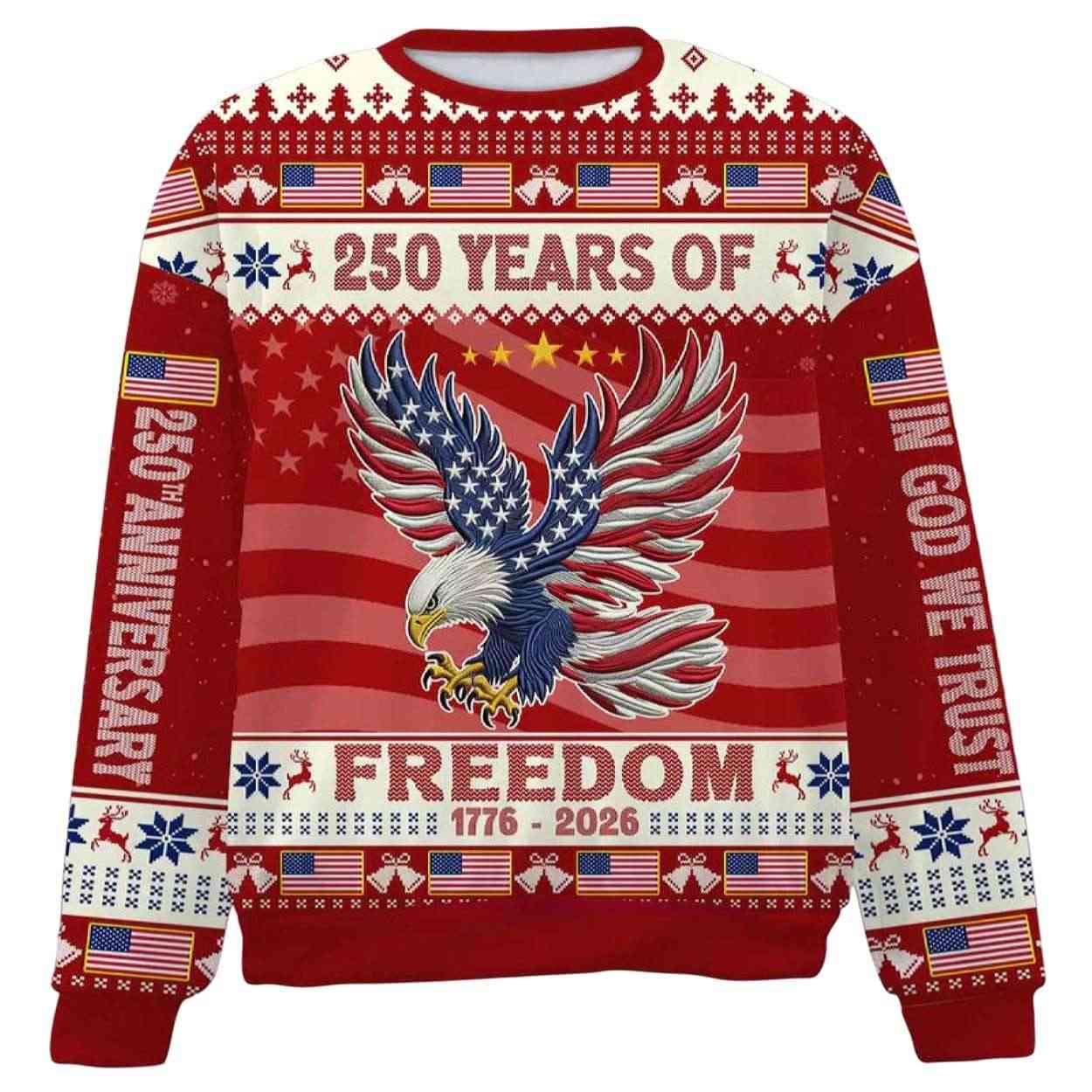 Mark 250 years of American freedom with this 250 Years Of Freedom 1776-2026 Ugly Sweater. Featuring a patriotic bald eagle, historic dates, and powerful slogans, it’s a wearable tribute to resilience, unity, and the enduring spirit of 1776 through 2026.