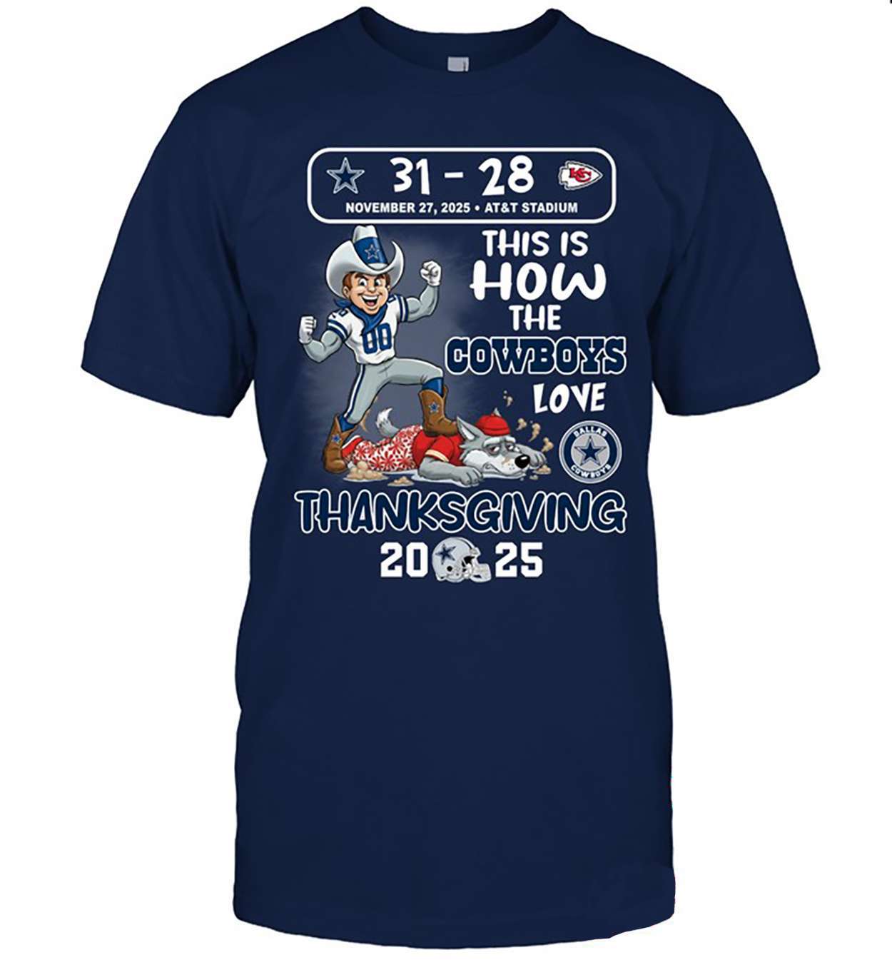 Honor the Cowboys’ thrilling 31-28 triumph over the Chiefs on Thanksgiving 2025 with this 31-28 Chiefs This Is The Cowboys Love Thanksgiving 2025 Shirt. Featuring iconic mascots, player names, and a nod to tradition, it’s a wearable tribute to grit, rivalry, and holiday pride.