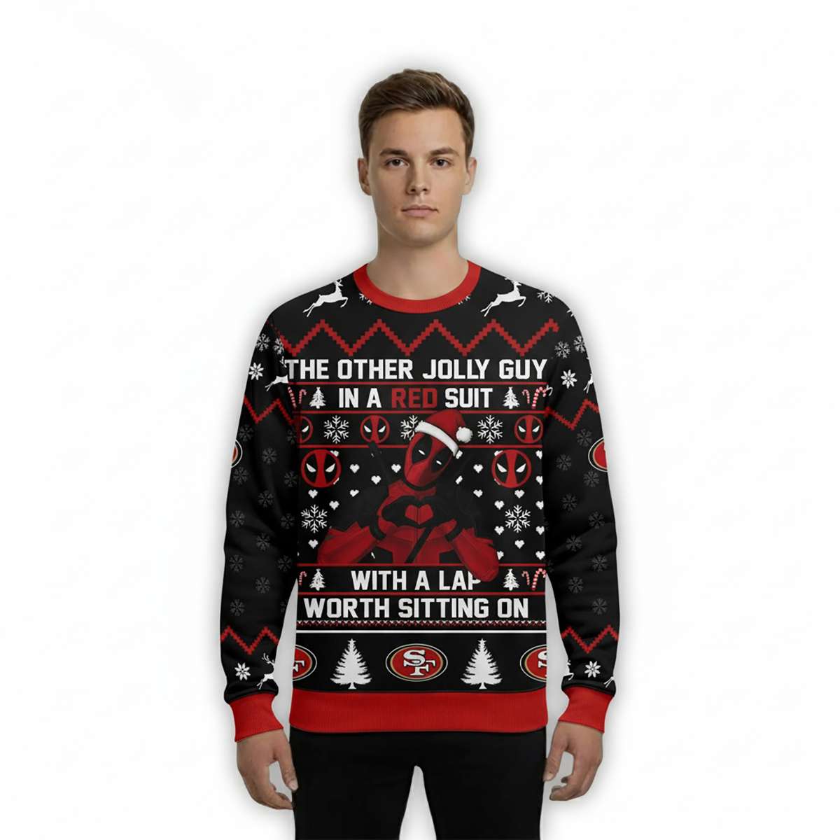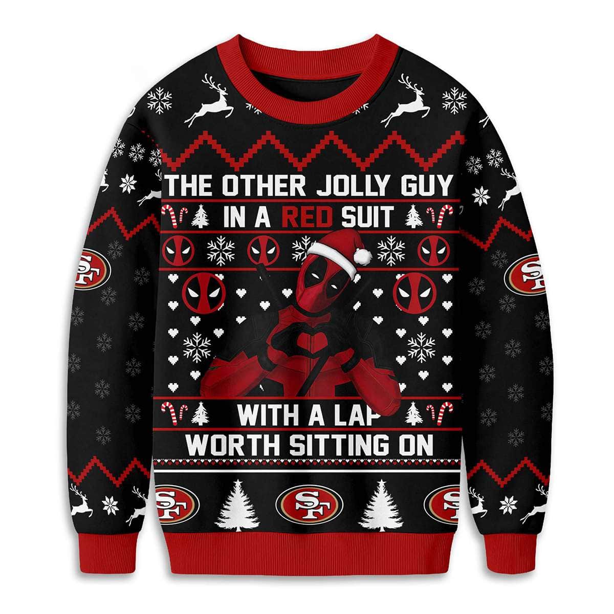 Add edge to your holiday wardrobe with the 49ers Deadpool The Other Jolly Guy In A Red Suit Christmas Ugly Sweater. Featuring Marvel’s irreverent antihero in red, this bold design blends comic wit, football legacy, and festive flair. A perfect pick for fans who thrive on humor and history.