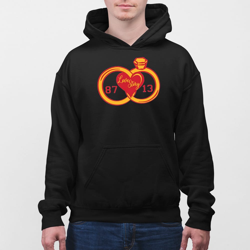The shirt showcases two golden rings merging at the center, enclosing a vivid heart inscribed with the words Love Story. Numbers “87” and “13” stand on opposite sides, echoing the idea of two worlds meeting yet becoming inseparable. The visual impact is immediate: it draws the eye to the language of unity, commitment, and enduring stories that extend beyond fashion.