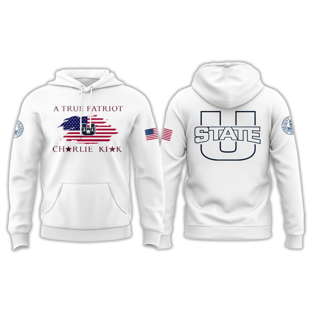 The design unites Utah State identity with a patriotic theme, implicitly connecting the wearer’s allegiance to campus culture and national discourse. It evokes the tense public moment when political violence interrupted a gathering of students and speakers.