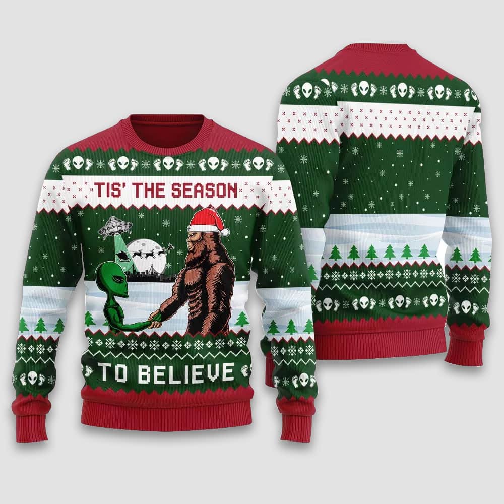 The Alien Bigfoot Tis The Season To Believe Ugly Christmas Sweater featuring Alien and Bigfoot has gained popularity after being shared across cryptid fan pages and holiday meme accounts, becoming a cult favorite for believers and skeptics alike.