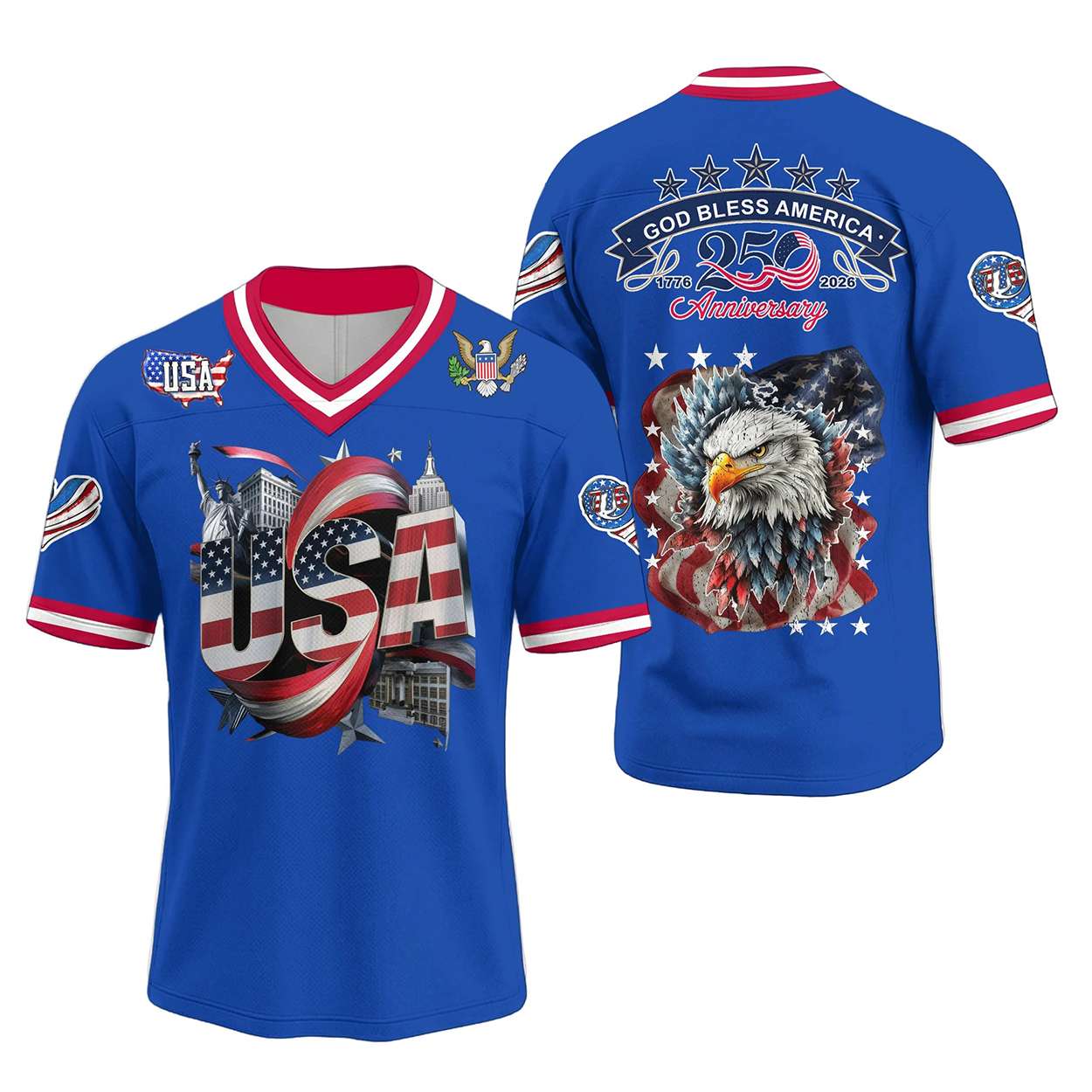 Mark 250 years of American independence with the America 250th Anniversary V-neck Jersey. Featuring bold patriotic symbols, historic dates, and iconic imagery, this design honors the nation’s journey from 1776 to 2026 with pride, unity, and enduring spirit.