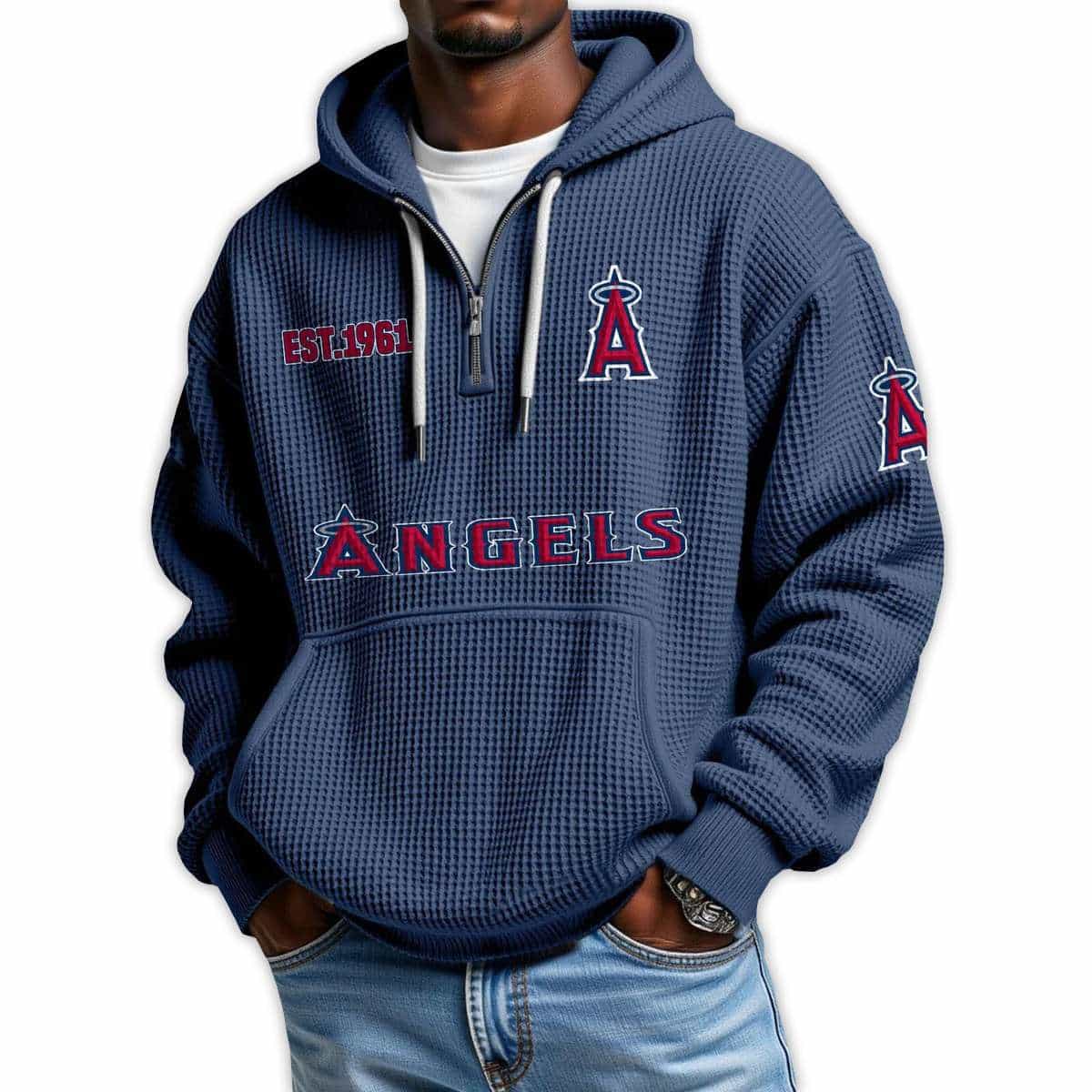 Show your loyalty with the Angels Est 1961 Quarter Zip Waffle Hoodie. Featuring bold graphics and historical nods to iconic players and pivotal moments, this hoodie connects fans to the enduring legacy of Los Angeles baseball and its cultural impact.
