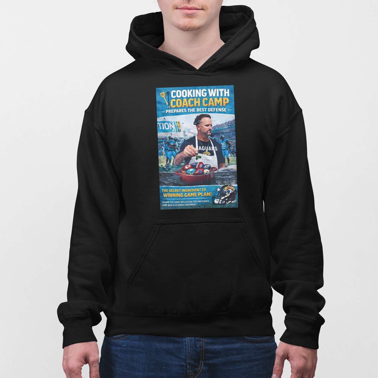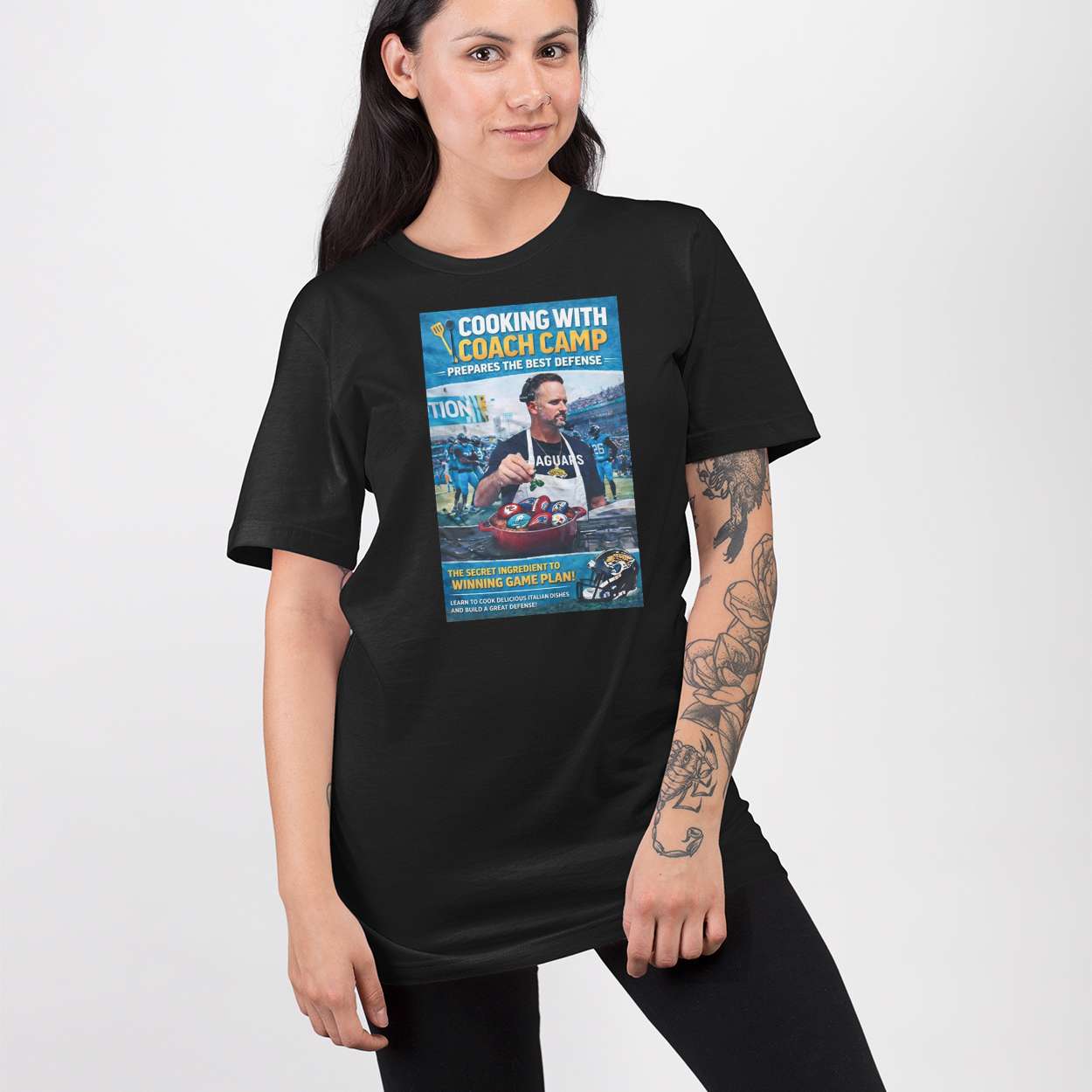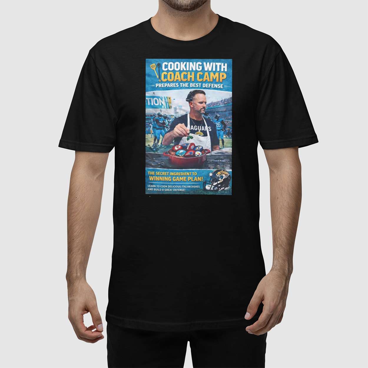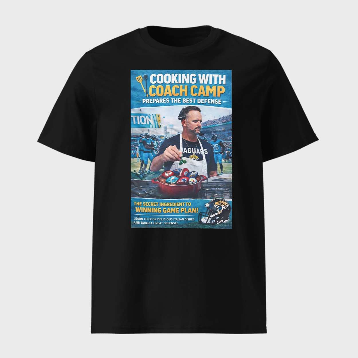 The Antonio Johnson Cooking With Coach Camp Shirt blends football intensity with kitchen creativity. Depicting Coach Camp stirring helmets in a pot, it’s a nod to the Jaguars’ defensive transformation and the strategic flavor behind their 2026 resurgence.