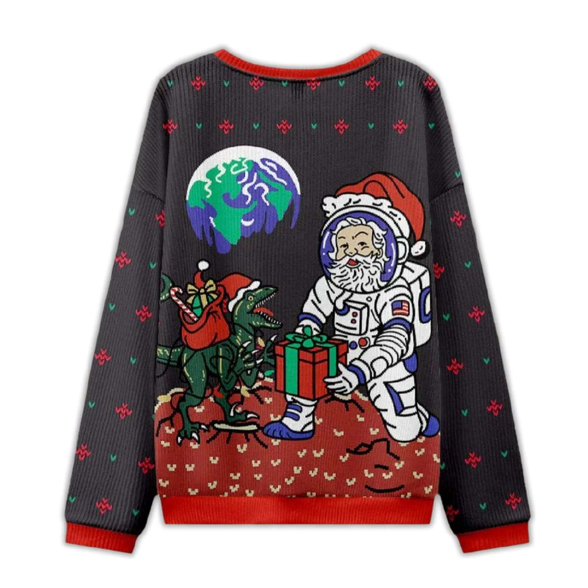 This sweater captures a surreal moment: Santa as an astronaut, delivering joy across galaxies. The design playfully reimagines tradition, suggesting that kindness and connection transcend planetary boundaries—even when shared with extraterrestrial friends under Earth’s distant glow.