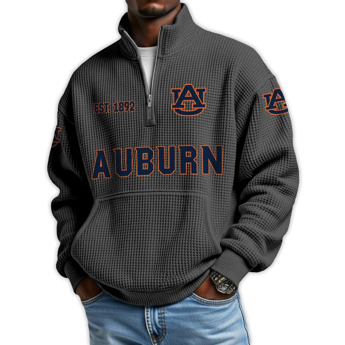 Show your pride in Southern grit with the Auburn Football Est 1892 Waffle Stand Collar Half Zip Sweatshirt. Featuring bold graphics and historic nods, this piece connects fans to legendary players, iconic rivalries, and the enduring legacy of Tiger football.