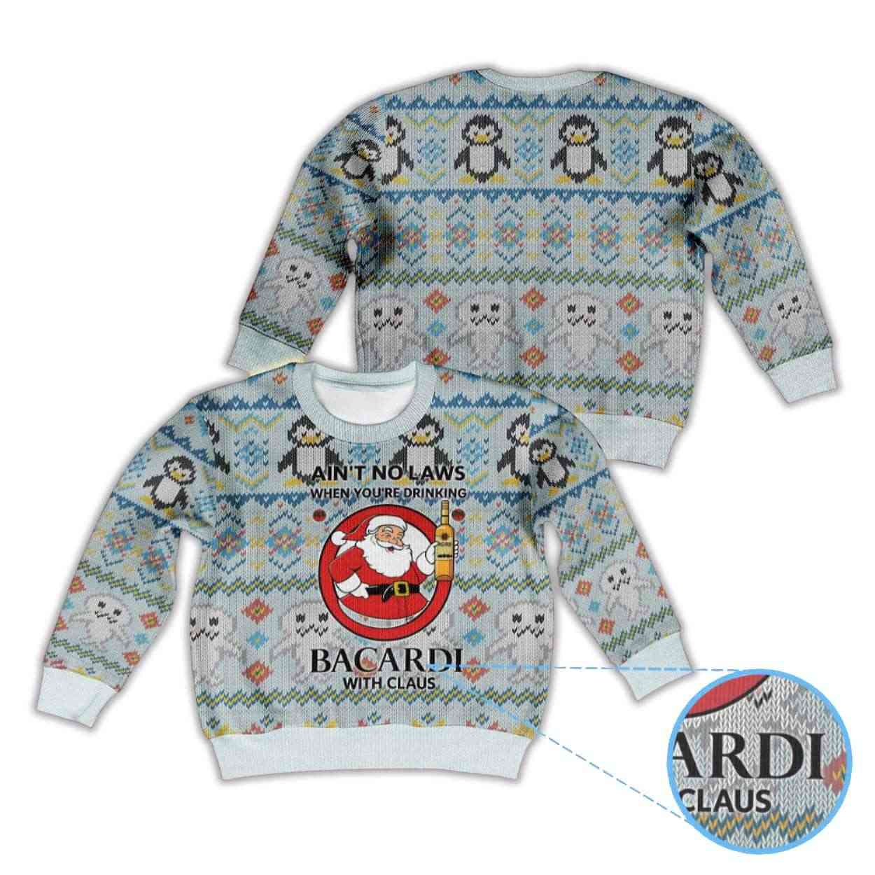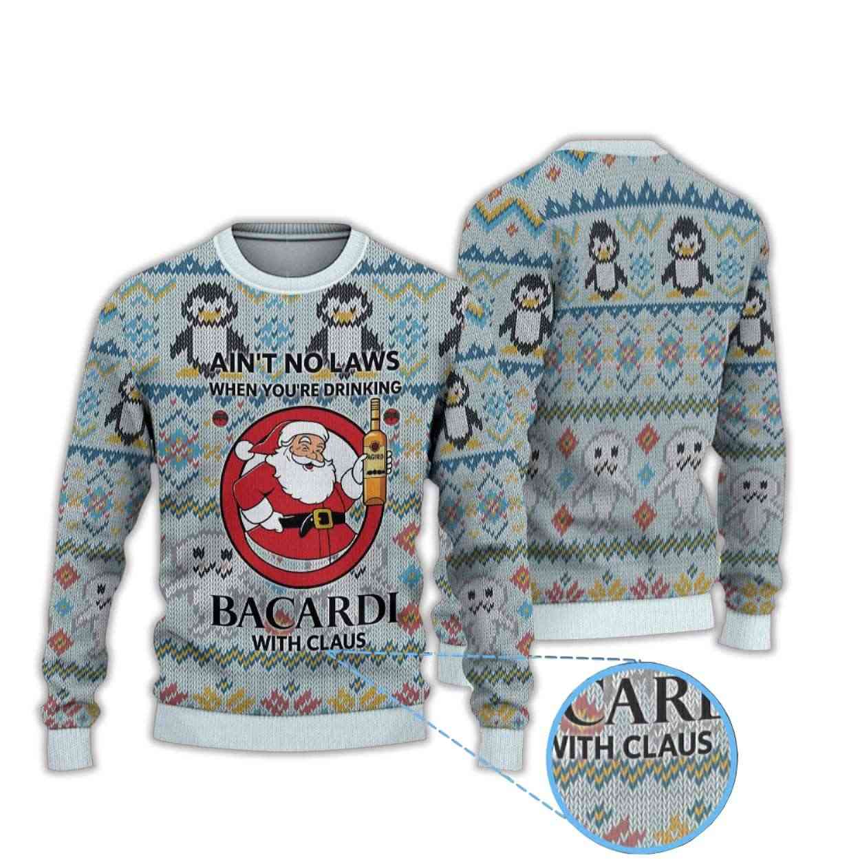 The phrase “Ain’t No Laws When You’re Drinking Bacardi With Claus” captures a cultural wink — referencing internet humor and social trends that turn ordinary sweaters into conversation starters. This piece connects tradition with today’s viral Christmas culture, spreading laughter wherever it goes.