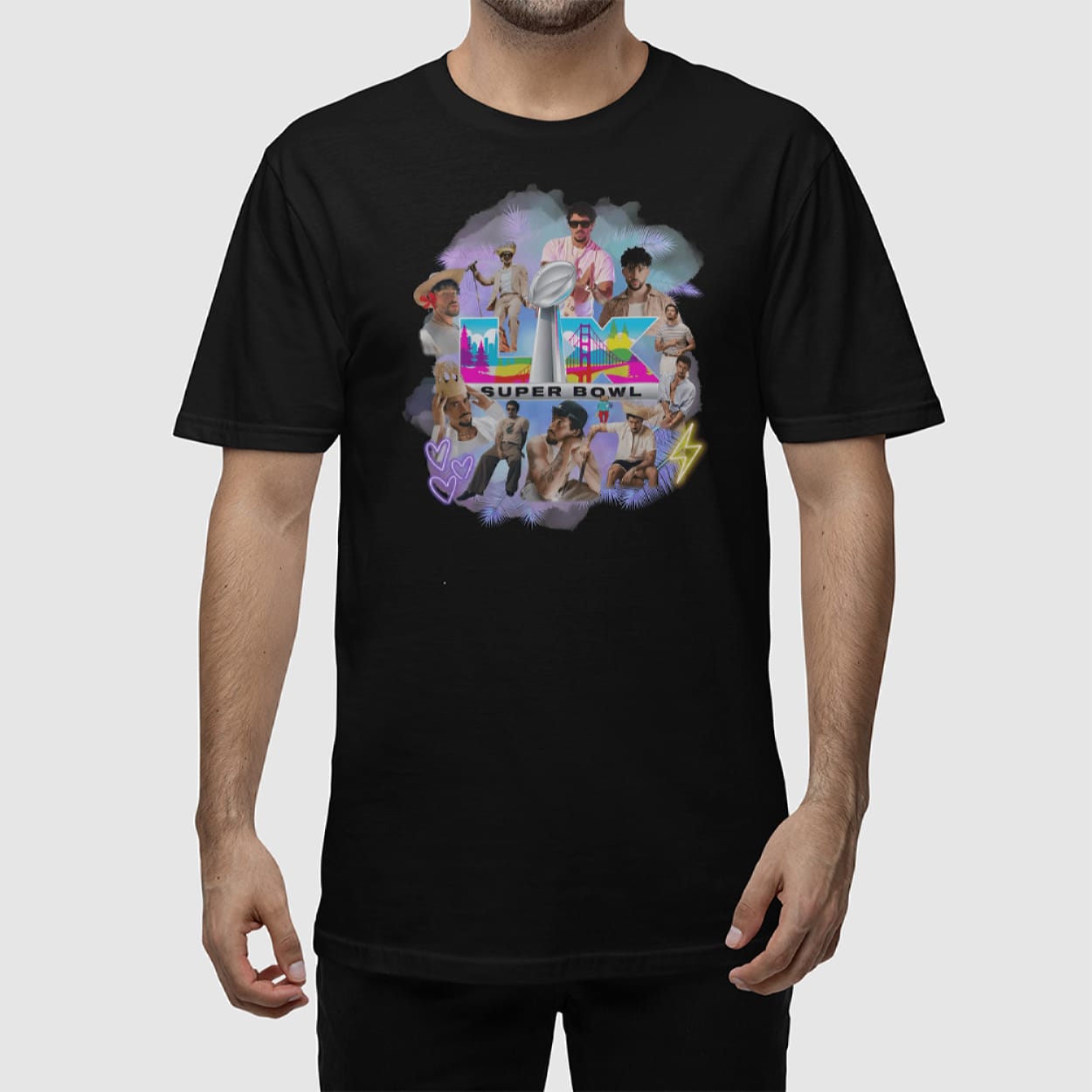 Unveil the energy of the Bad Bunny Super Bowl LX Halftime Show Shirt, featuring striking graphics of the Latin superstar. This design connects music, history, and the cultural impact of Super Bowl performances, perfect for fans who admire art, identity, and unforgettable events.