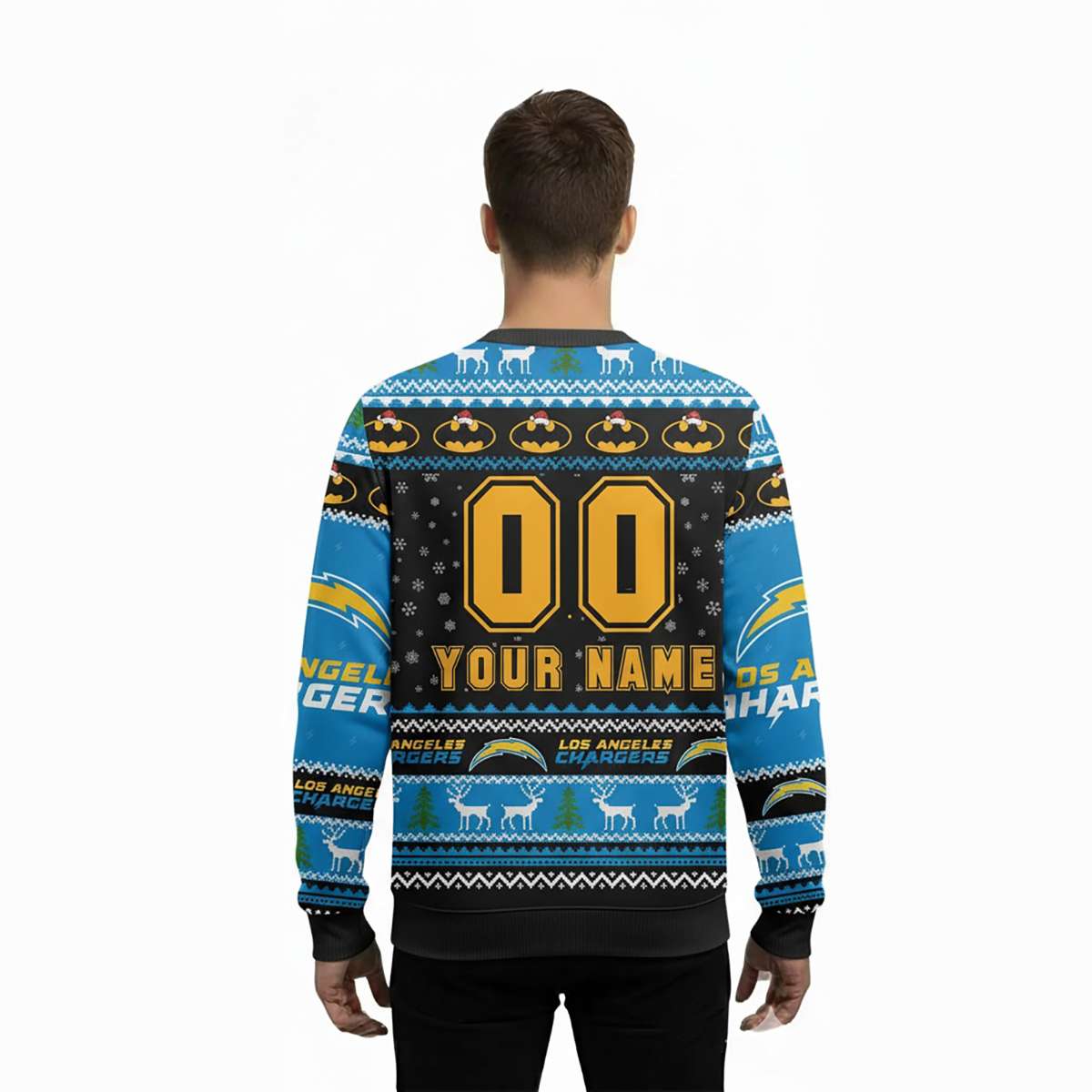 From comic panels to stadium lights, this design bridges pop culture and sports history. Snowflakes, reindeer, and Batman logos form a festive tapestry, while the customizable back lets you wear your name like a badge of honor—just like heroes do.