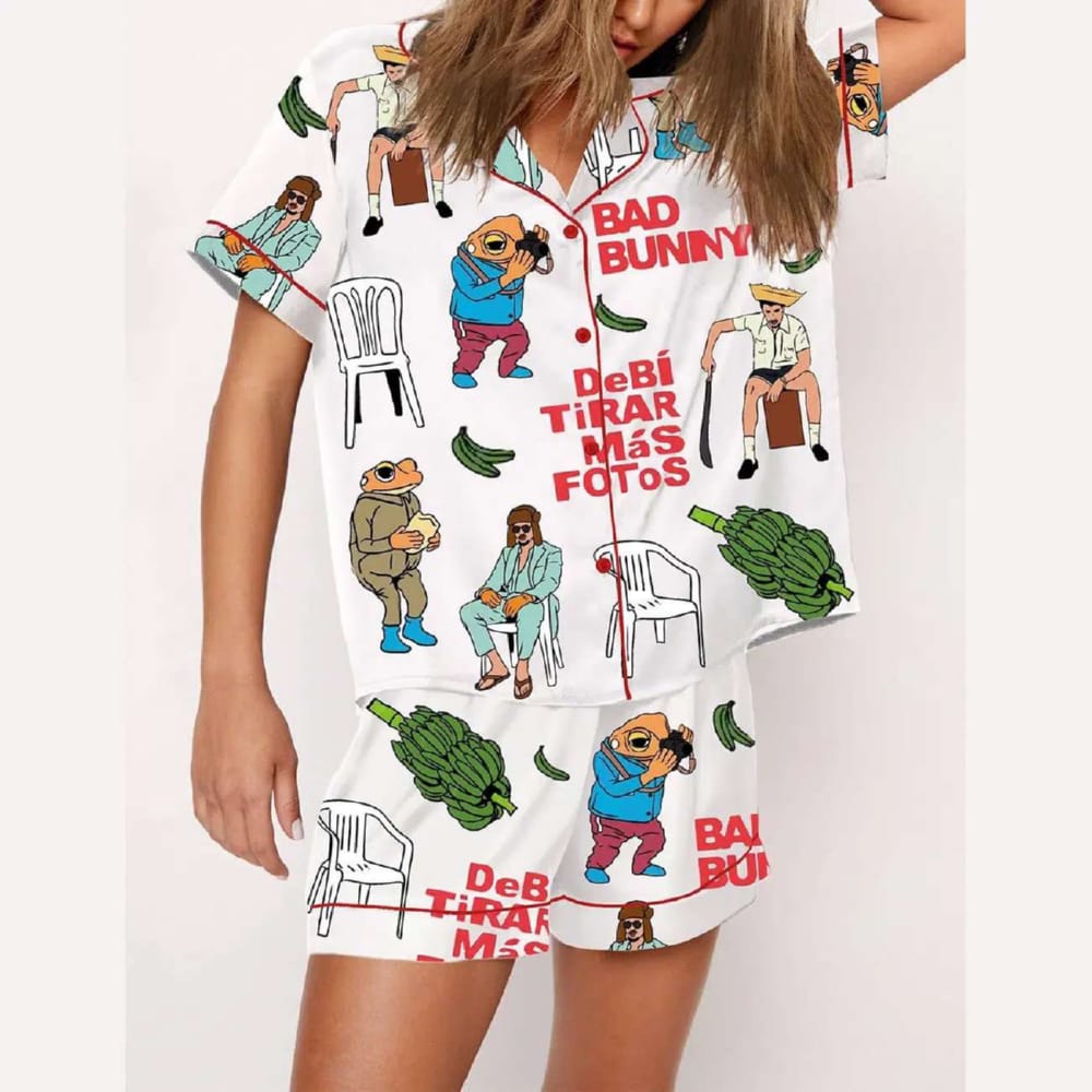 The BDB Debi Tirar Mas Fotos Album Pajama Set is a tribute to the vibrant and ever-popular Bad Bunny, a cultural icon whose music and influence have captured global attention. His track “DebĂ Tirar Más Fotos,” which translates to “I Should Have Taken More Photos,” reflects a sentiment shared by many—cherishing the moments we wish we could relive. This pajama set is a playful homage to Bad Bunny’s unique style and his connection with fans through his music and social media presence, perfectly blending the digital and physical worlds.