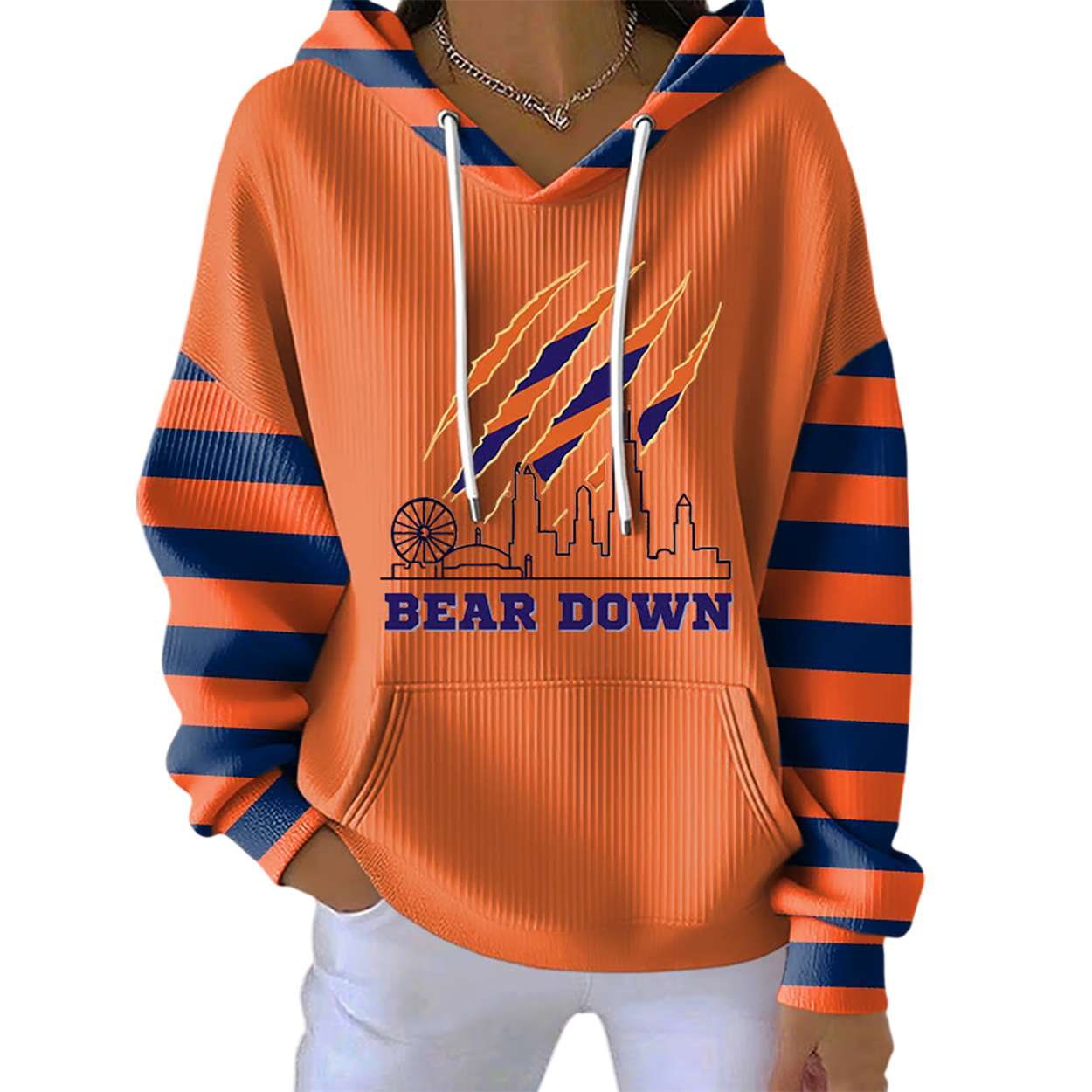Show your city pride with the Bear Down Football Skyline Pit Striped Hoodie. Featuring bold claw marks, a Ferris wheel, and skyline graphics, this hoodie connects sports passion with urban grit and historic resilience. Perfect for fans who live the legacy.
