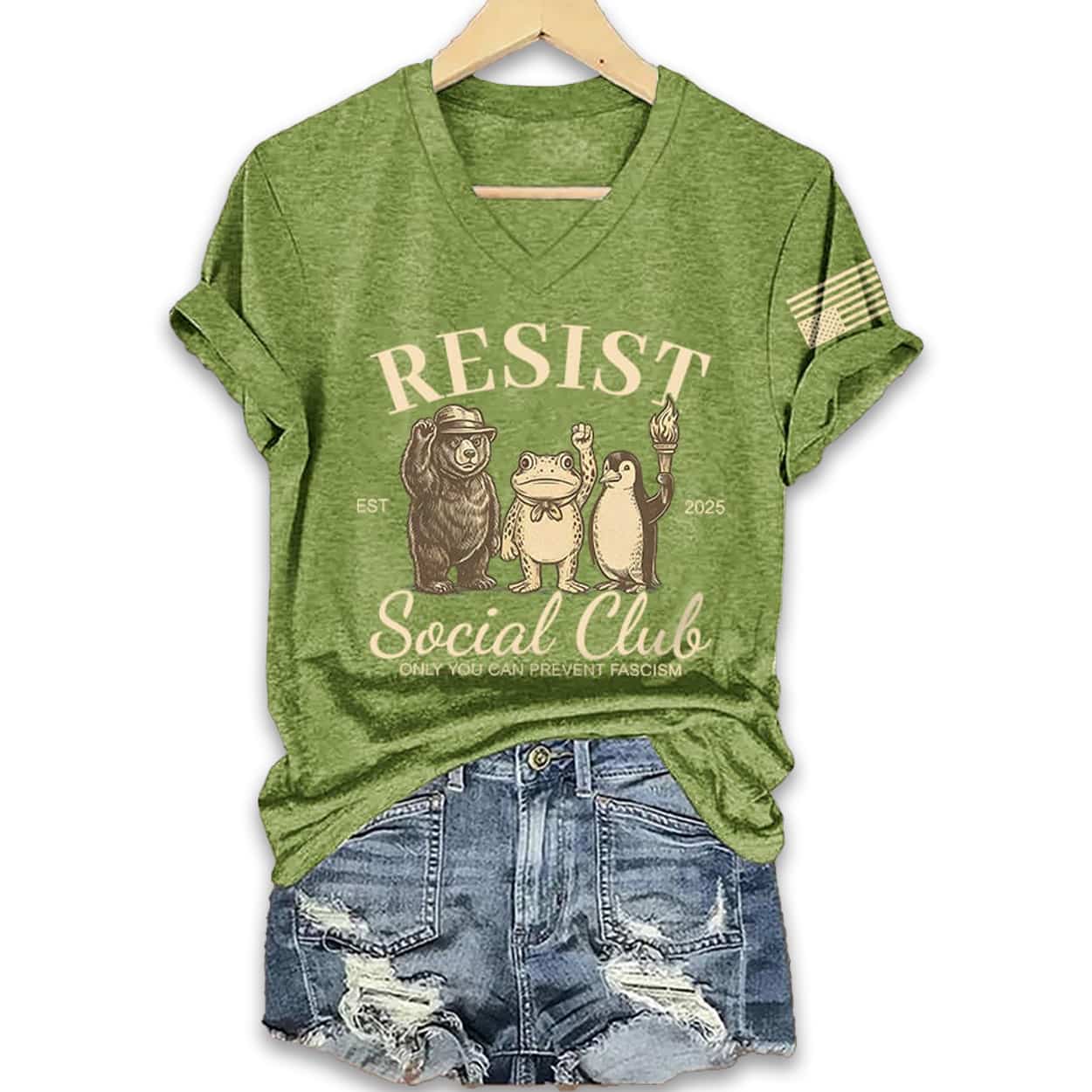 In a world that demands a voice, make yours heard without saying a word. Introducing the Bear Frog Penguin Portland Frog Resist Social Club Only You Can Prevent Fascism Shirt, a powerful piece of wearable art that unites classic Americana with a modern call for vigilance. Featuring a stoic bear, a determined frog, and a torch-bearing penguin, this shirt isn’t just clothing—it’s a statement of unity and a symbol of collective strength.
