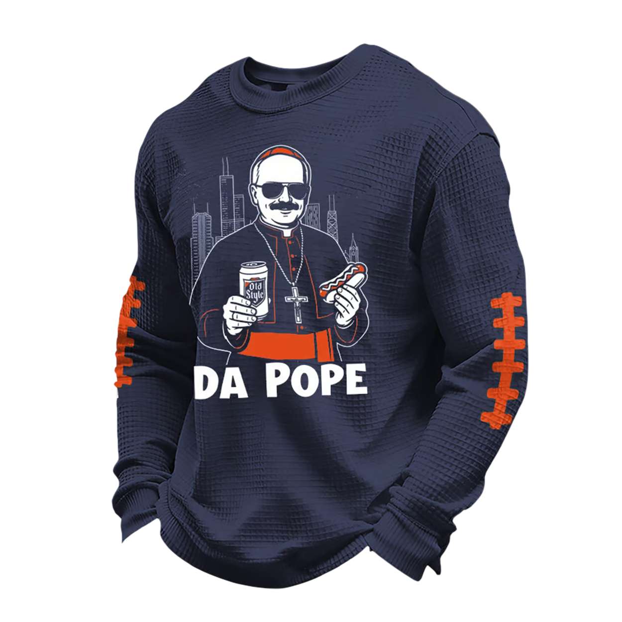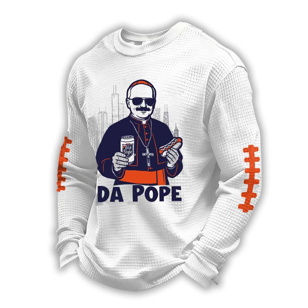 The Bears Da Pope Waffle Long Sleeve T-Shirt showcases a cartoon pontiff decked in shades, gripping a can of Old Style and a hot dog—two icons of Chicago’s blue-collar soul. It’s a nod to the city’s unapologetic love for grit and flavor.