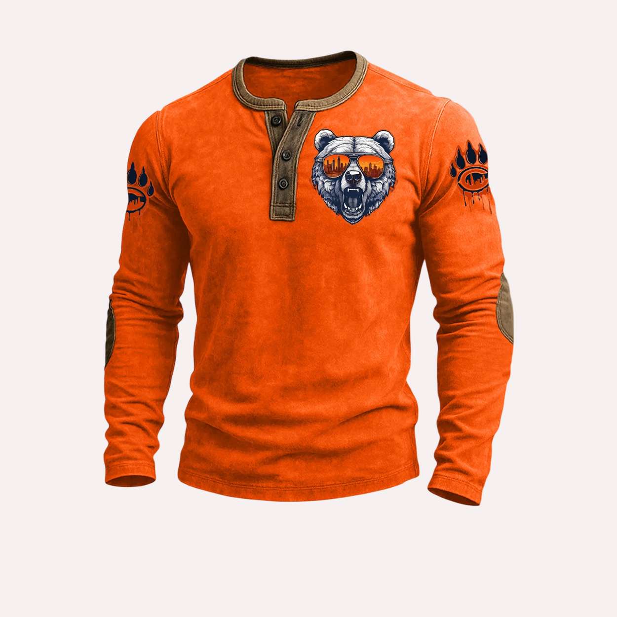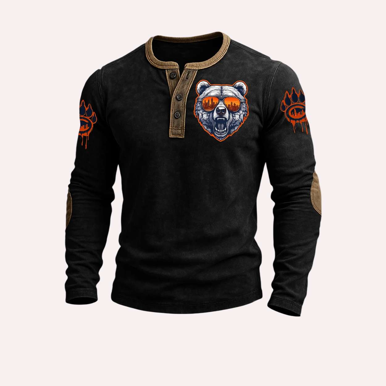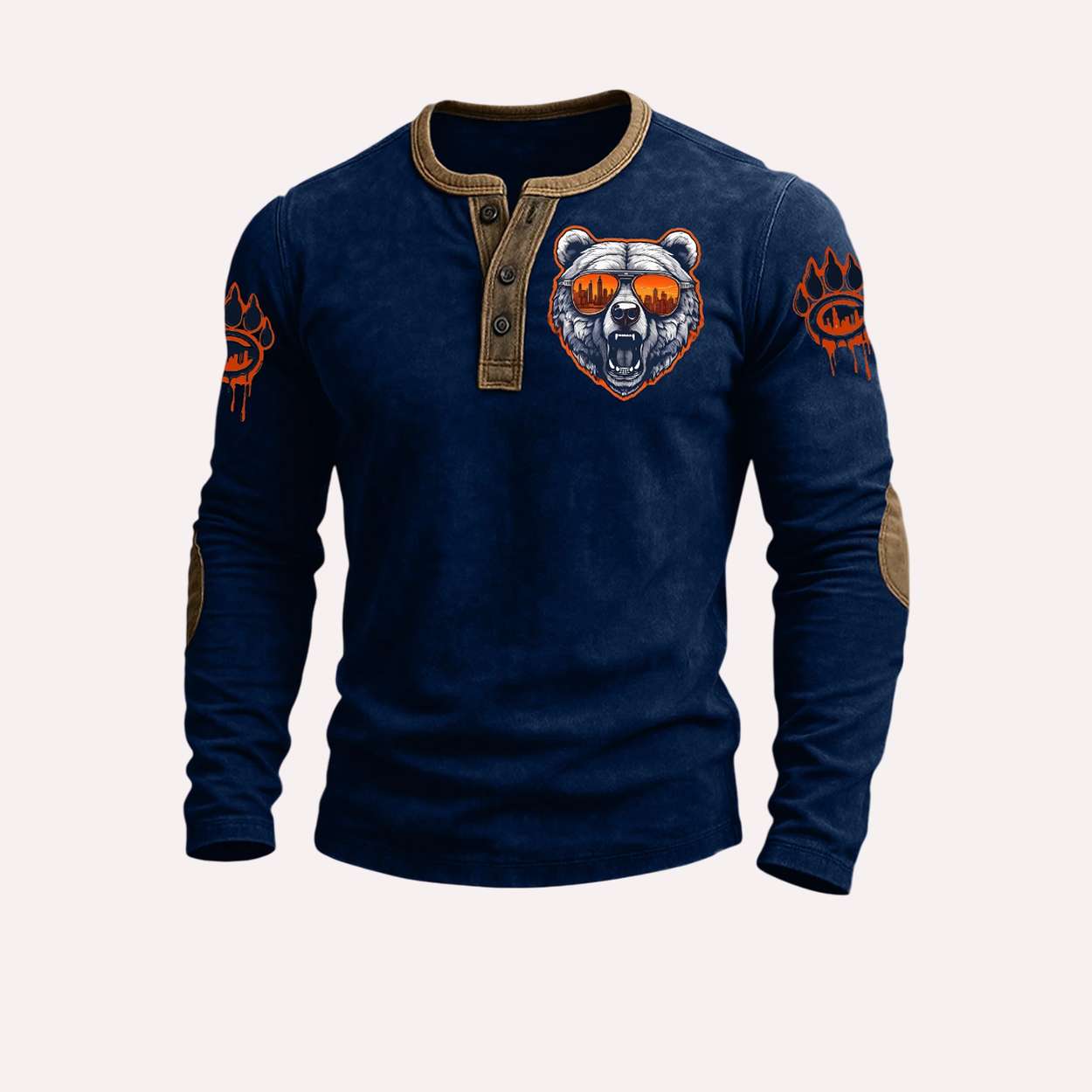 Channel urban grit and wild spirit with the Bears Football Skyline Print Henley Top. Featuring a bold bear graphic, cityscape reflections, and claw-marked sleeves, this shirt fuses streetwear with legacy—perfect for fans who value strength, roots, and bold design.