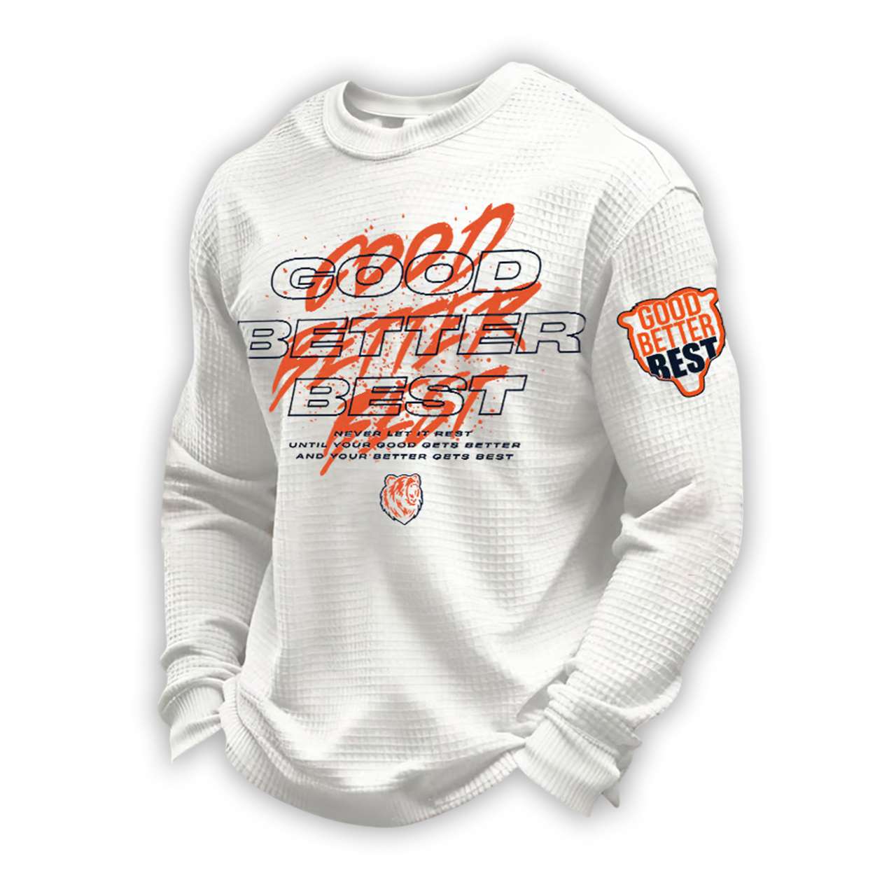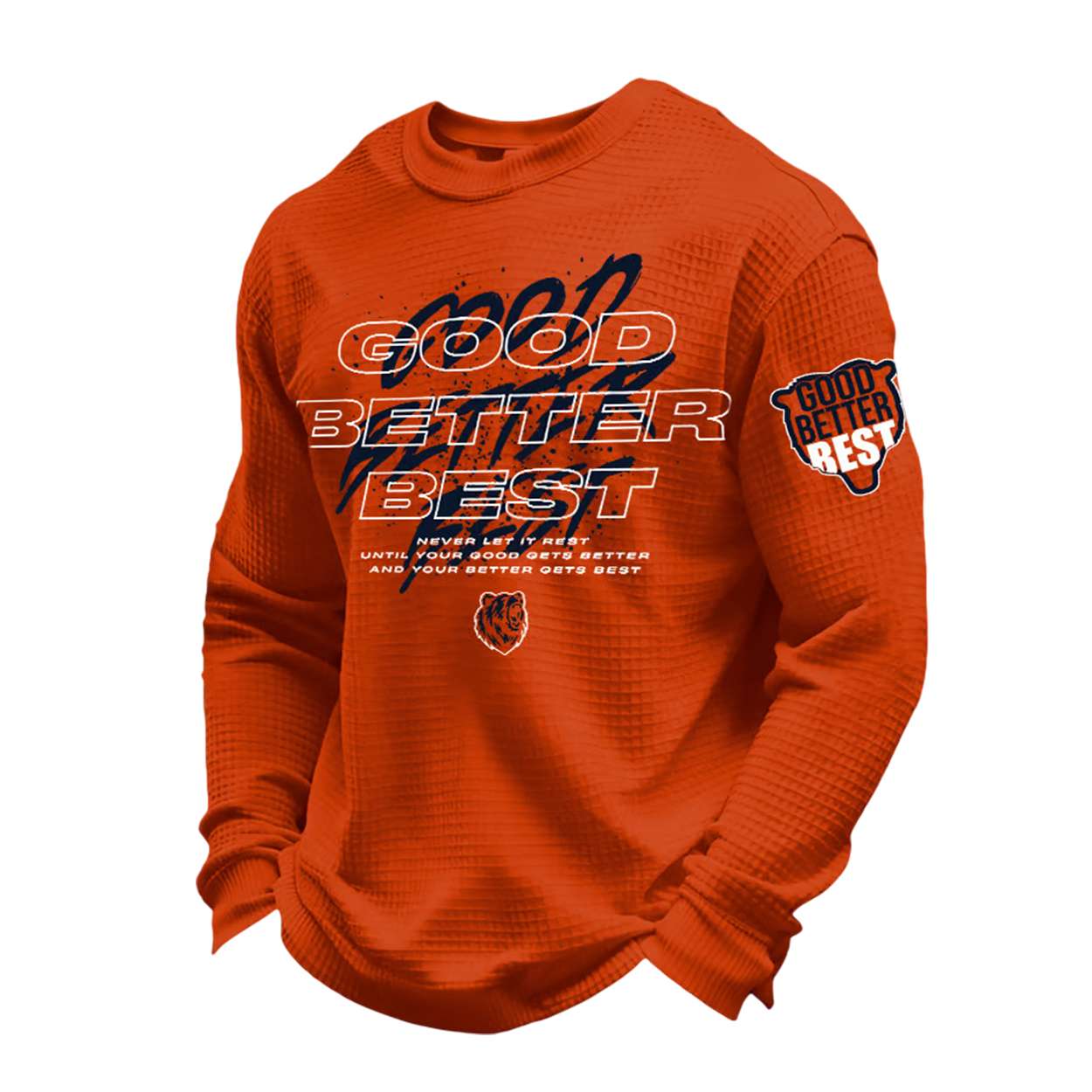 Ignite your drive with the Bears Good Better Best Print Waffle Sweatshirt. Featuring bold typography and a motivational mantra inspired by athletic grit and historical perseverance, this piece connects ambition with legacy. Wear the mindset of champions—past and present.